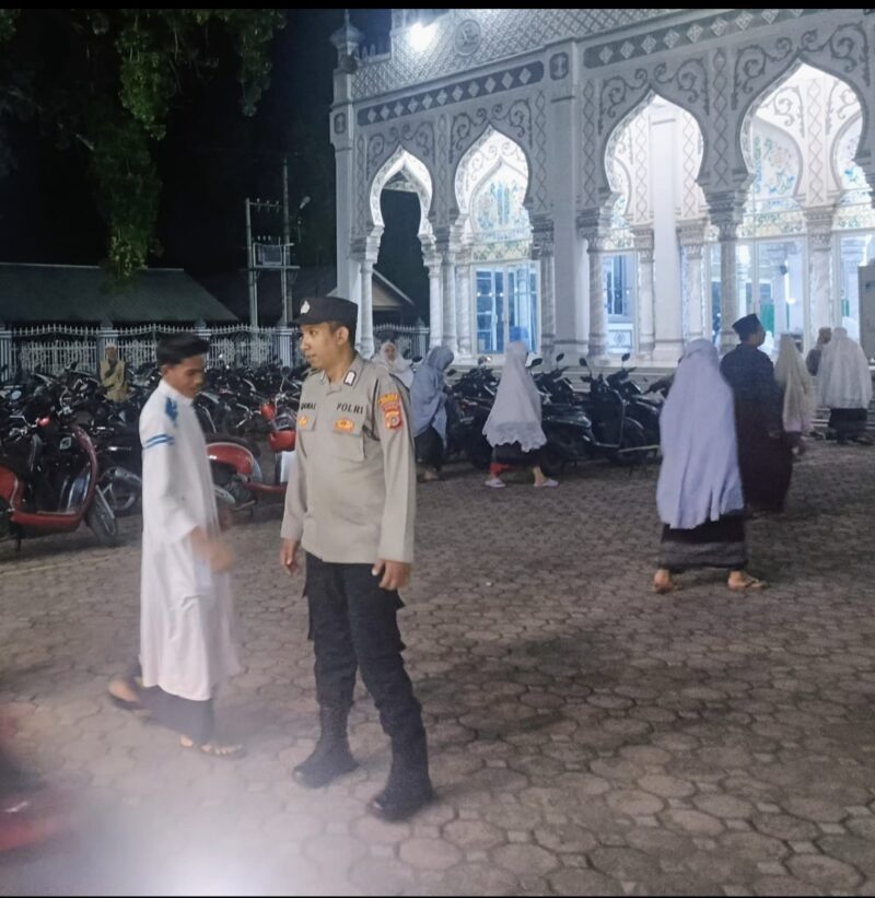 TLii|Aceh|ACEH UTARA – Guna memberikan rasa aman dan nyaman bagi umat Muslim dalam menjalankan ibadah di bulan suci Ramadhan, personel Polsek Dewantara melaksanakan pengamanan Shalat Tarawih di Masjid Besar Bujang Salim, Desa Keude Krueng Geukueh, Kecamatan Dewantara, Kabupaten Aceh Utara, Senin (23/2/2026) malam.