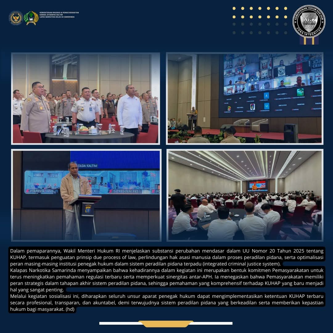 TIMELINES INEWS INVESTIGASI, Samarinda, Kepala Lembaga Pemasyarakatan (Kalapas) Narkotika Kelas IIA Samarinda, Jaka Prihatin, menghadiri undangan Kepolisian Daerah Kalimantan Timur dalam kegiatan Sosialisasi Undang-Undang Nomor 20 Tahun 2025 tentang Kitab Undang-Undang Hukum Acara Pidana (KUHAP). Kegiatan ini menghadirkan Wakil Menteri Hukum Republik Indonesia, Prof. Dr. Edward Omar Sharif Hiariej, sebagai narasumber utama. Selasa (10/2)