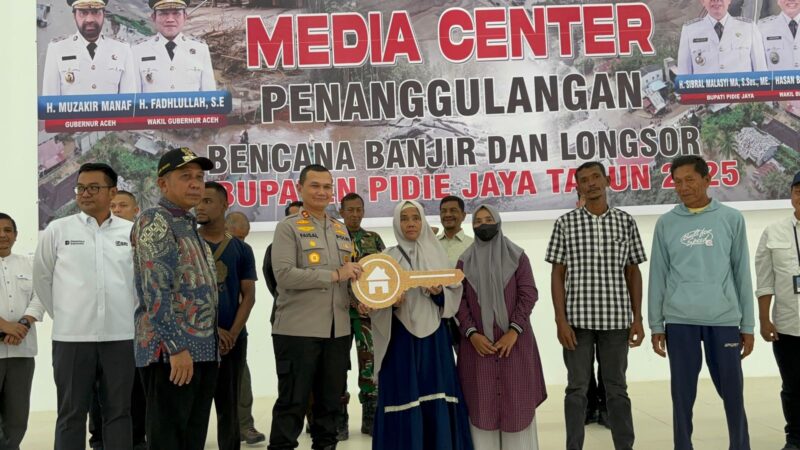 Meureudu,timelinesinews.com– Kapolres Pidie Jaya AKBP Ahmad Faisal Pasaribu mendampingi Pakor Polres Pidie Jaya Kombes Pol Thelly Iskandar Muda menghadiri kegiatan peresmian dan penyerahan kunci Hunian Sementara (Huntara) kepada masyarakat terdampak bencana di Kecamatan Meureudu, Kabupaten Pidie Jaya, Sabtu 14 Februari 2026.