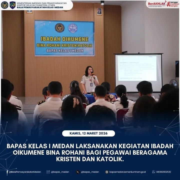 TIMELINES INEWS INVESTIGASI, Medan Balai Pemasyarakatan Kelas I Medan melaksanakan kegiatan Ibadah Oikumene Bina Rohani bagi pegawai beragama Kristen dan Katolik di aula Bapas Kelas I Medan, Kamis (12/03/2026). Kegiatan ini digelar sebagai bentuk pembinaan rohani guna memperkuat iman, meningkatkan integritas, serta menumbuhkan semangat pelayanan dalam menjalankan tugas sebagai insan pemasyarakatan.
