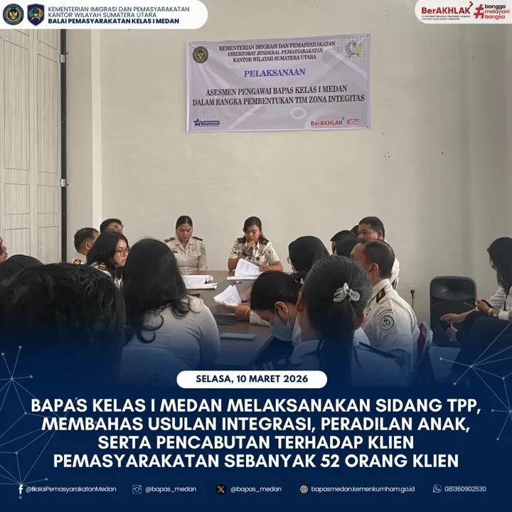TIMELINES INEWS INVESTIGASI, Medan Balai Pemasyarakatan (Bapas) Kelas I Medan melaksanakan Sidang Tim Pengamat Pemasyarakatan (TPP) pada Selasa (10/03/2026). Kegiatan ini membahas berbagai usulan terkait klien pemasyarakatan, mulai dari usulan integrasi, peradilan anak, hingga pencabutan status klien.