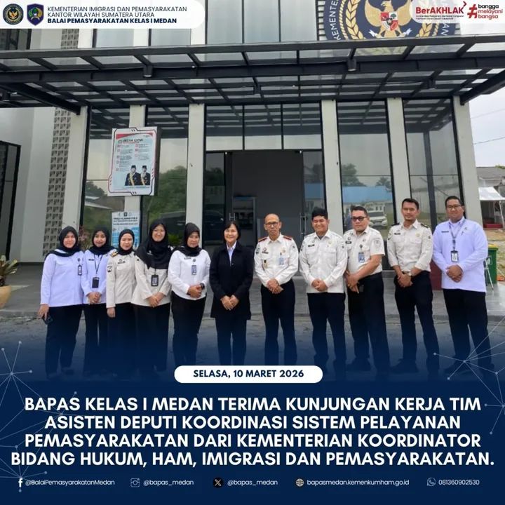 TIMELINES INEWS INVESTIGASI, Medan Balai Pemasyarakatan (Bapas) Kelas I Medan menerima kunjungan kerja Tim Asisten Deputi Koordinasi Sistem Pelayanan Pemasyarakatan dari Kementerian Koordinator Bidang Hukum, HAM, Imigrasi dan Pemasyarakatan, Selasa (10/3/2026). Kunjungan ini dilaksanakan dalam rangka sinkronisasi dan koordinasi terkait strategi pelayanan pemasyarakatan di lingkungan Kantor Wilayah Direktorat Jenderal Pemasyarakatan Sumatera Utara.