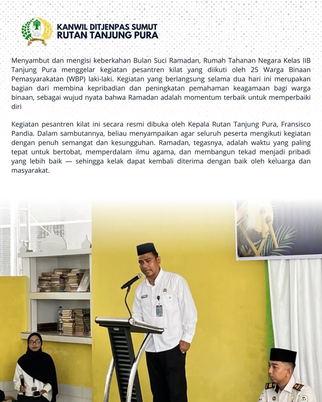 Pesantren kilat tersebut secara resmi dibuka oleh Kepala Rutan Tanjung Pura, Fransisco Pandia. Dalam sambutannya, ia mengajak seluruh peserta untuk mengikuti kegiatan dengan penuh semangat dan kesungguhan.