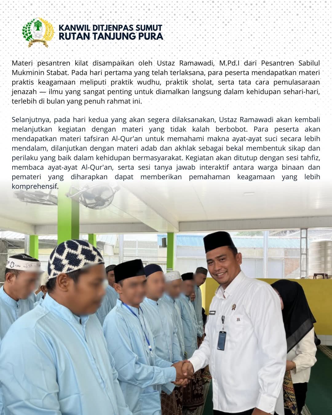 TIMELINES INEWS INVESTIGASI, Tanjung Pura Dalam rangka menyambut dan mengisi keberkahan Bulan Suci Ramadan, Rumah Tahanan Negara (Rutan) Kelas IIB Tanjung Pura menggelar kegiatan pesantren kilat yang diikuti oleh 25 Warga Binaan Pemasyarakatan (WBP) laki-laki, Rabu (11/03/2026).