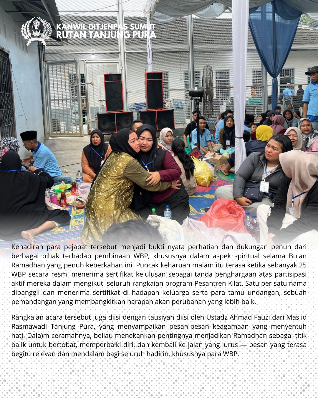 Kegiatan yang sarat makna ini sekaligus menjadi momen penutupan program Pesantren Kilat yang telah berlangsung selama dua hari penuh di lingkungan Rutan Tanjung Pura.