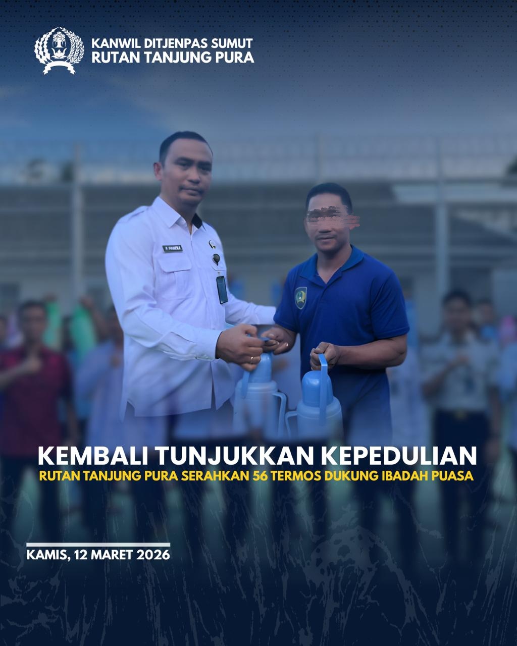 TIMELINES INEWS INVESTIGASI, Tanjung Pura Semangat berbagi di bulan Ramadhan 1447H kembali ditunjukkan oleh jajaran Rutan Tanjung Pura. Sebagai wujud kepedulian terhadap Warga Binaan Pemasyarakatan (WBP) yang tengah menjalankan ibadah puasa, Rutan Tanjung Pura membagikan sebanyak 56 unit termos kepada seluruh kamar hunian, di mana setiap kamar mendapatkan 2 unit termos. Kamis (12/03)