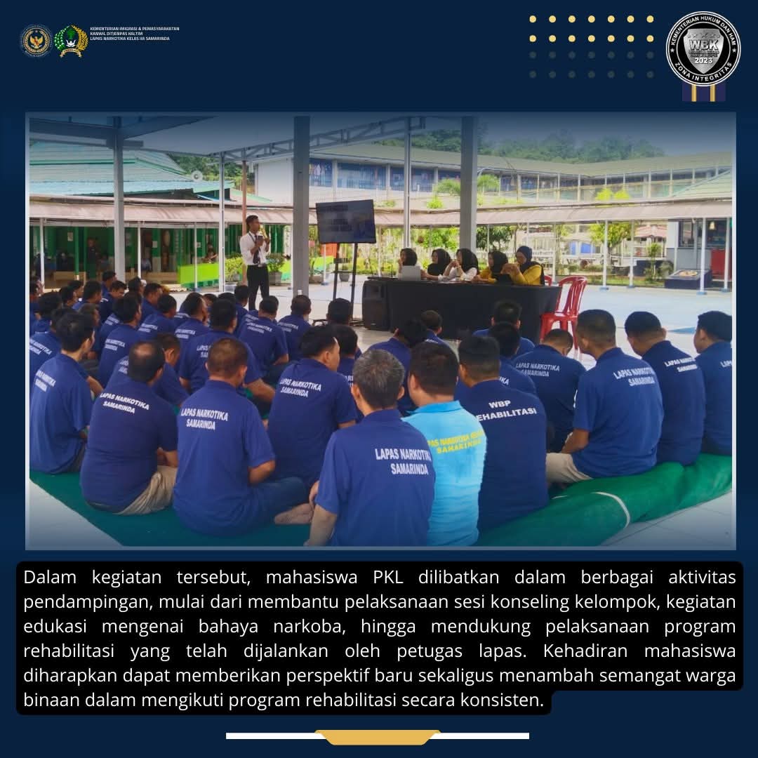 Pihak Lapas Narkotika Samarinda menyambut baik partisipasi mahasiswa PKL dari Universitas Mulawarman, karena dinilai dapat memberikan kontribusi positif dalam meningkatkan kualitas program pembinaan, khususnya dalam bidang rehabilitasi bagi warga binaan, Tandasnya.