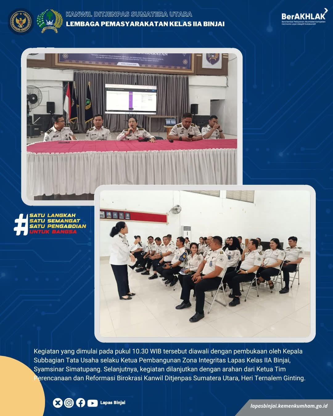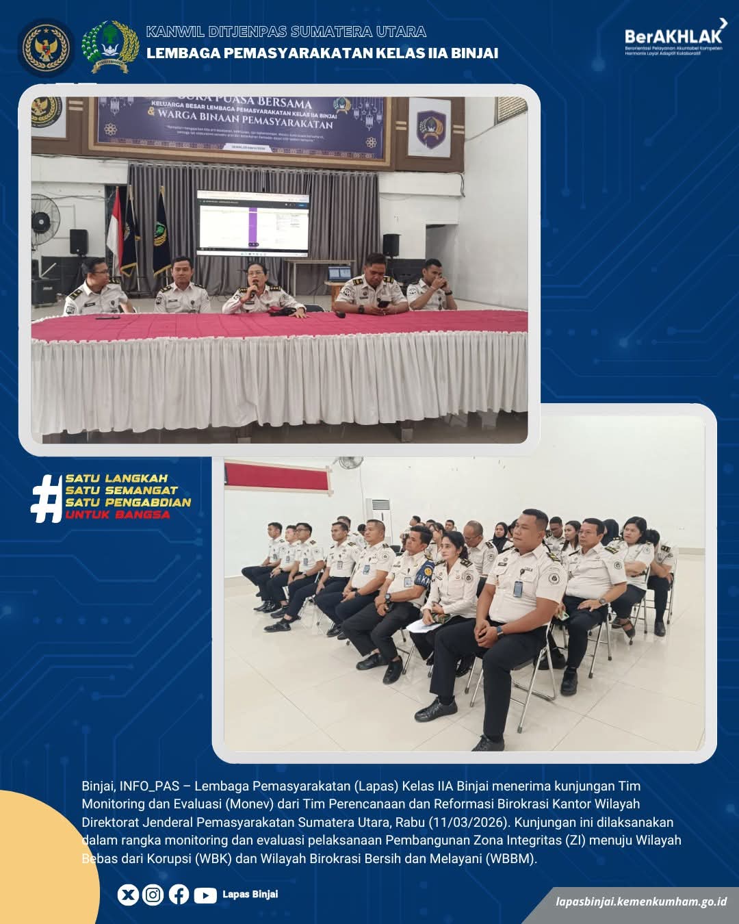 TIMELINES INEWS INVESTIGASI, Binjai Lembaga Pemasyarakatan (Lapas) Kelas IIA Binjai menerima kunjungan Tim Monitoring dan Evaluasi (Monev) dari Tim Perencanaan dan Reformasi Birokrasi Kantor Wilayah Direktorat Jenderal Pemasyarakatan Sumatera Utara, Rabu (11/03/2026). Kunjungan ini dilaksanakan dalam rangka melakukan monitoring dan evaluasi terhadap pelaksanaan Pembangunan Zona Integritas (ZI) menuju predikat Wilayah Bebas dari Korupsi (WBK) dan Wilayah Birokrasi Bersih dan Melayani (WBBM).