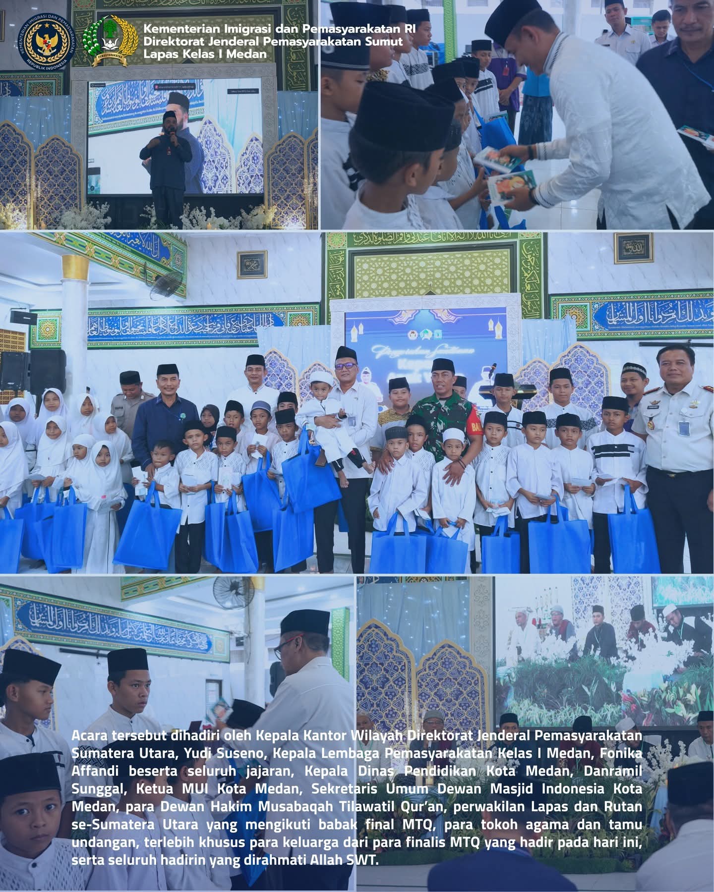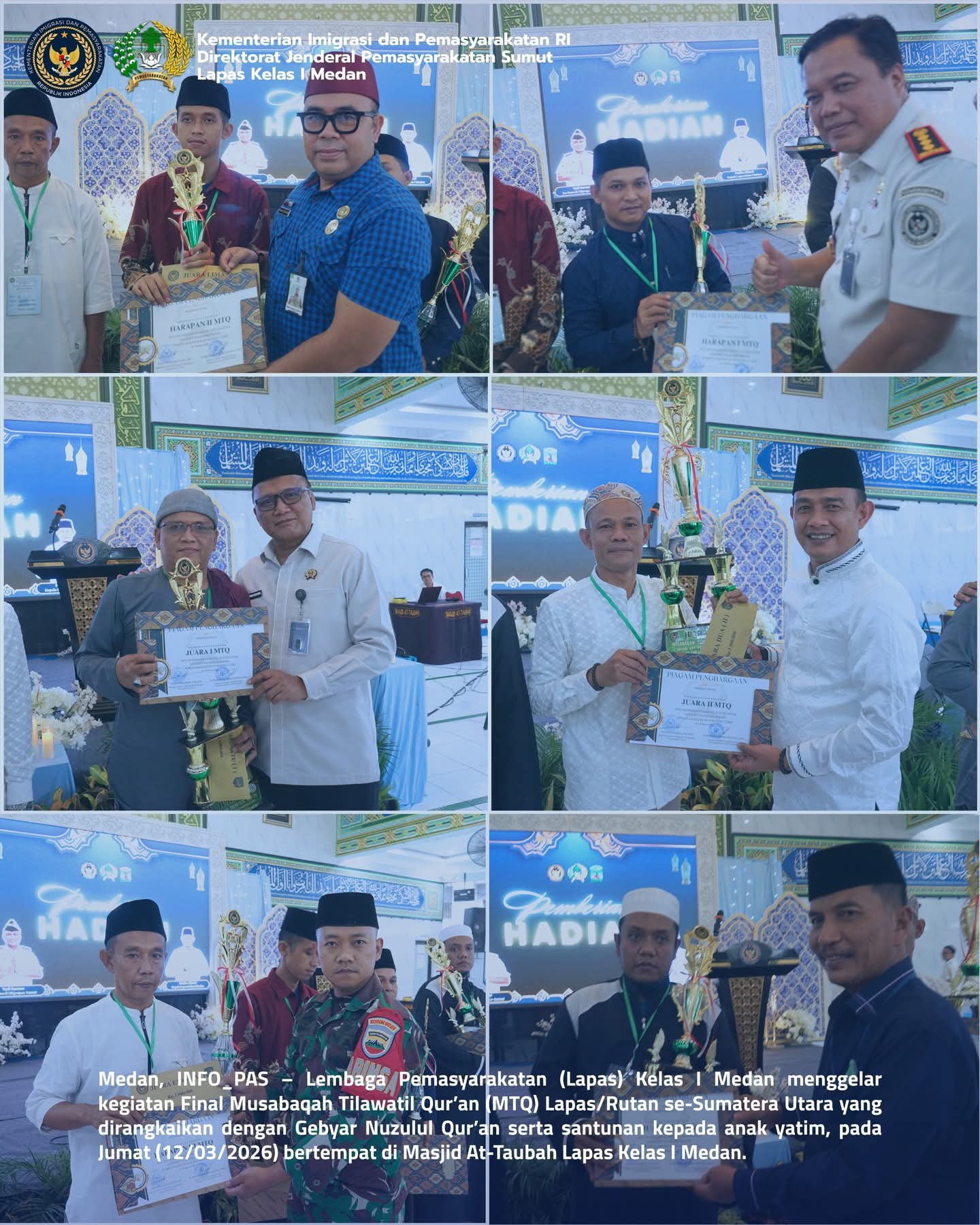 TIMELINES INEWS INVESTIGASI, MedanLembaga Pemasyarakatan (Lapas) Kelas I Medan menggelar Final Musabaqah Tilawatil Qur’an (MTQ) Lapas/Rutan se-Sumatera Utara yang dirangkaikan dengan Gebyar Nuzulul Qur’an serta pemberian santunan kepada anak yatim. Kegiatan tersebut berlangsung di Masjid At-Taubah Lapas Kelas I Medan pada Jumat (12/03/2026).