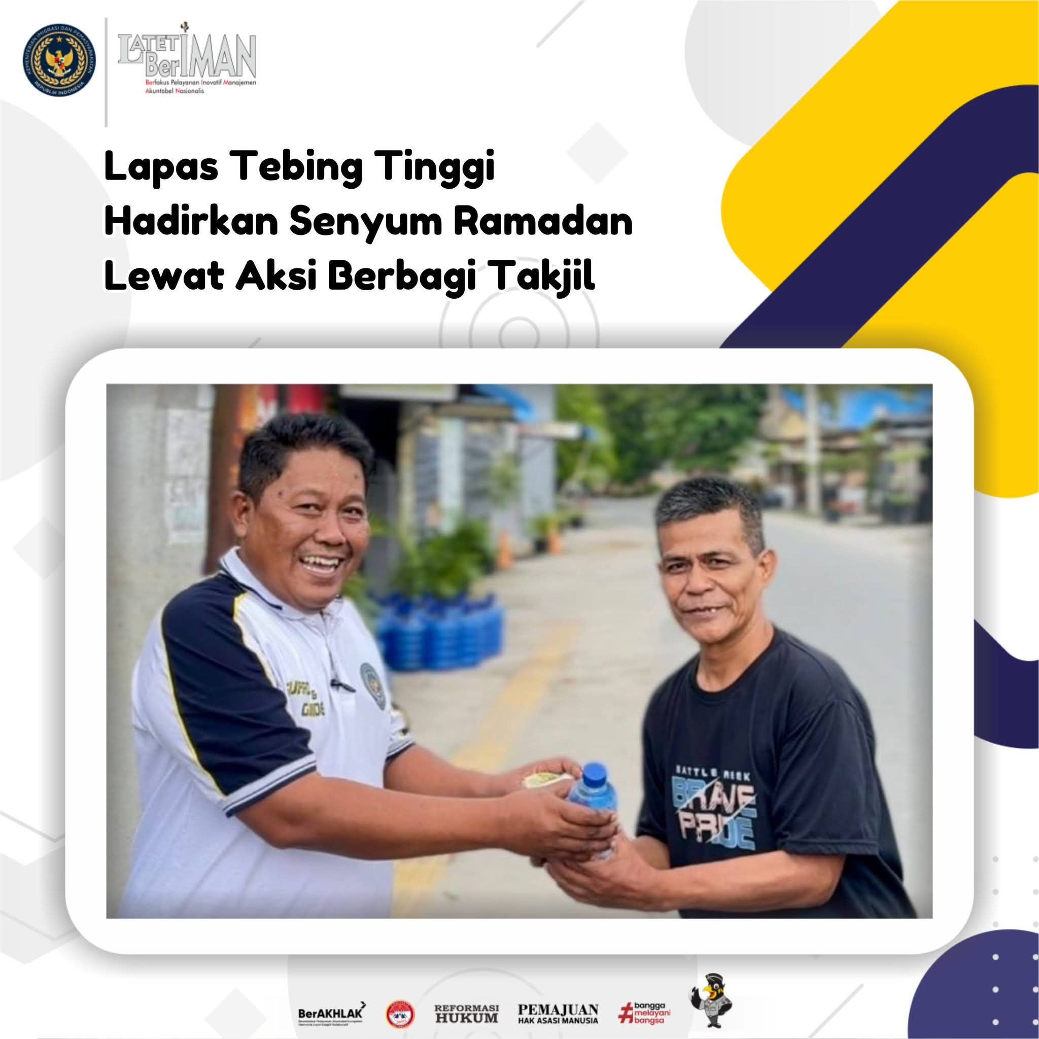 Kepala Lapas Tebing Tinggi, Dede Mulyadi, menyampaikan bahwa kegiatan berbagi takjil ini merupakan bagian dari upaya menumbuhkan nilai-nilai kepedulian dan kebersamaan di bulan Ramadan.