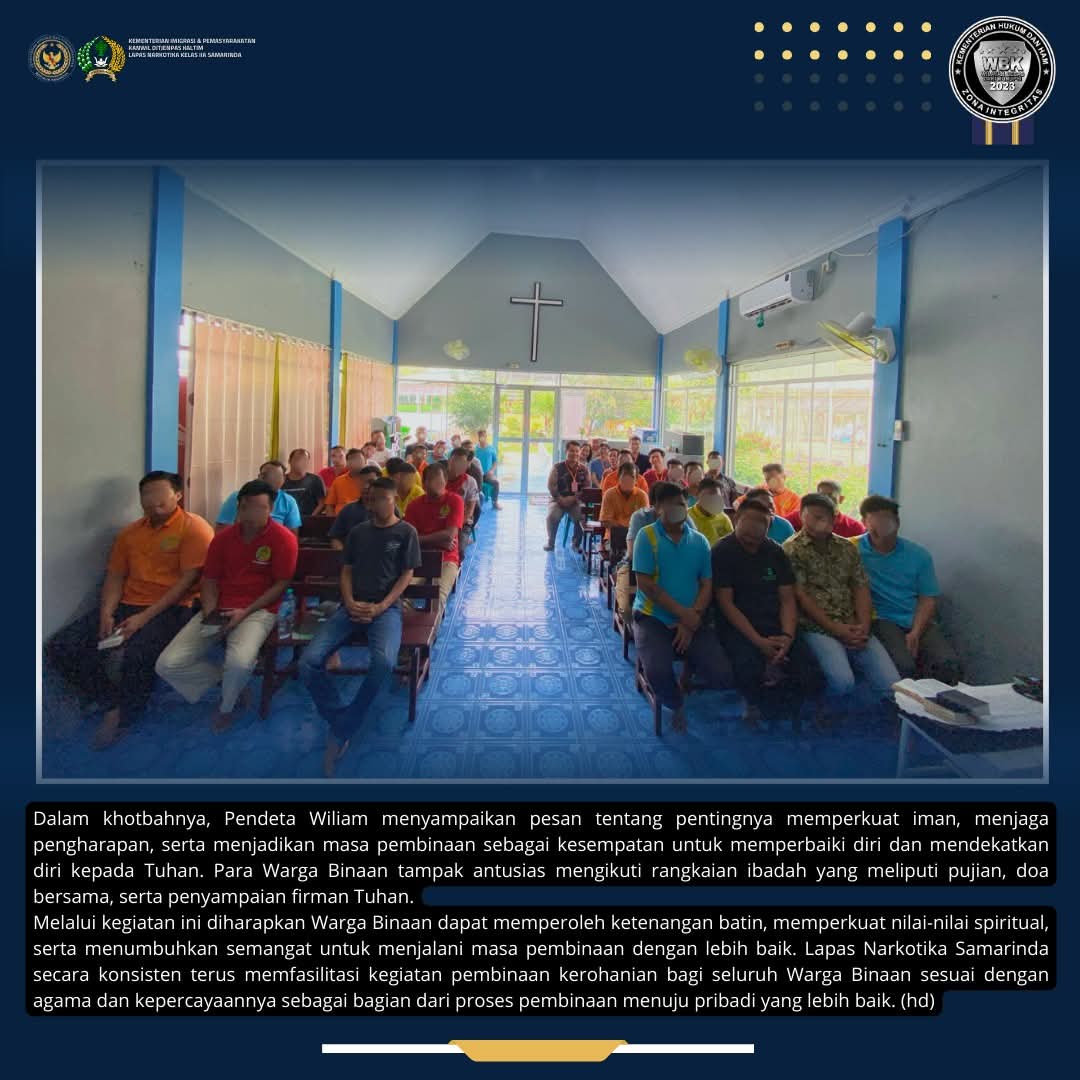 Ibadah tersebut dipimpin oleh Pendeta Wiliam dari Gereja Reformed Injili Indonesia (GRII) Samarinda dan diikuti oleh sejumlah Warga Binaan Kristen dengan penuh khidmat. Kegiatan ini juga mendapat pendampingan dari petugas Lapas sebagai bentuk dukungan terhadap pelaksanaan pembinaan kerohanian bagi para Warga Binaan.