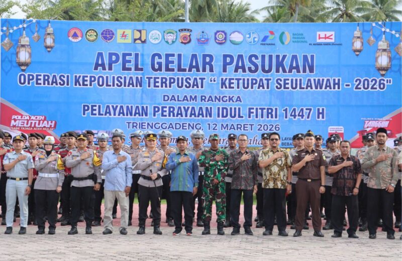 TLii.Meureudu – Polres Pidie Jaya melaksanakan Apel Gelar Pasukan Operasi Ketupat Seulawah Tahun 2026 dalam rangka kesiapan pengamanan arus mudik dan perayaan Hari Raya Idul Fitri 1447 Hijriah. Kegiatan tersebut dilaksanakan pada Kamis 12 Maret 2026 pukul 16.00 WIB di Lapangan Mapolres Pidie Jaya, Gampong Teungkluet, Kecamatan Trienggadeng, Kabupaten Pidie Jaya.
