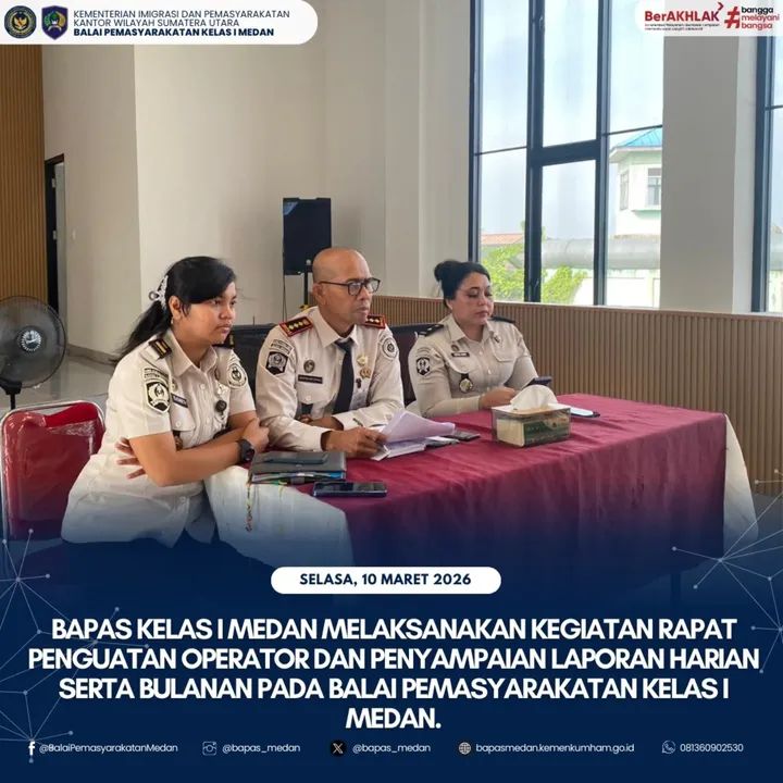 TIMELINES INEWS INVESTIGASI, Medan, 10 Maret 2026 Balai Pemasyarakatan (Bapas) Kelas I Medan melaksanakan kegiatan Rapat Penguatan Operator dan Penyampaian Laporan Harian serta Bulanan.