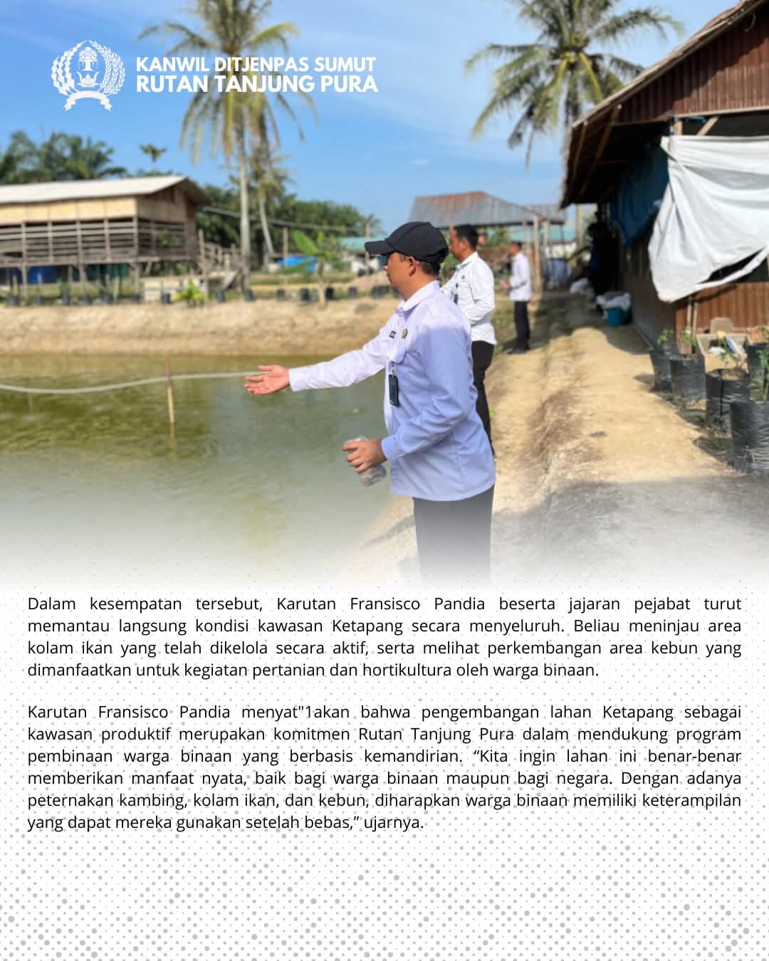 Fransisco Pandia menyampaikan bahwa pengembangan lahan Ketapang sebagai kawasan produktif merupakan komitmen Rutan Tanjung Pura dalam mendukung program pembinaan warga binaan berbasis kemandirian.