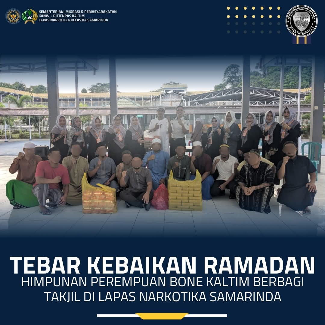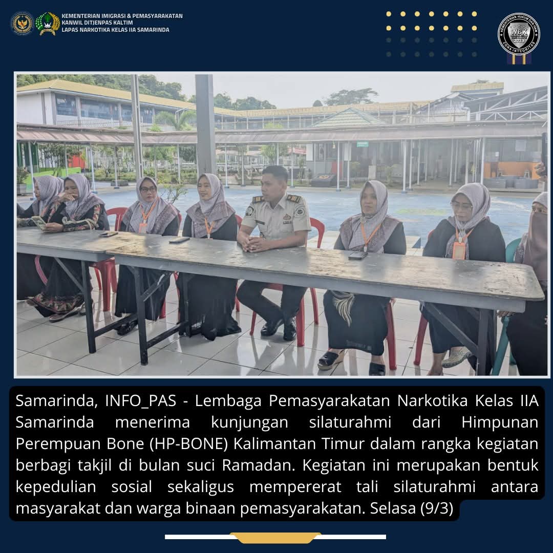 TIMELINES INEWS INVESTIGASI, Samarinda, Lembaga Pemasyarakatan Narkotika Kelas IIA Samarinda menerima kunjungan silaturahmi dari Himpunan Perempuan Bone (HP-BONE) Kalimantan Timur dalam rangka kegiatan berbagi takjil di bulan suci Ramadan. Kegiatan ini merupakan bentuk kepedulian sosial sekaligus mempererat tali silaturahmi antara masyarakat dan warga binaan pemasyarakatan. Selasa (9/3)