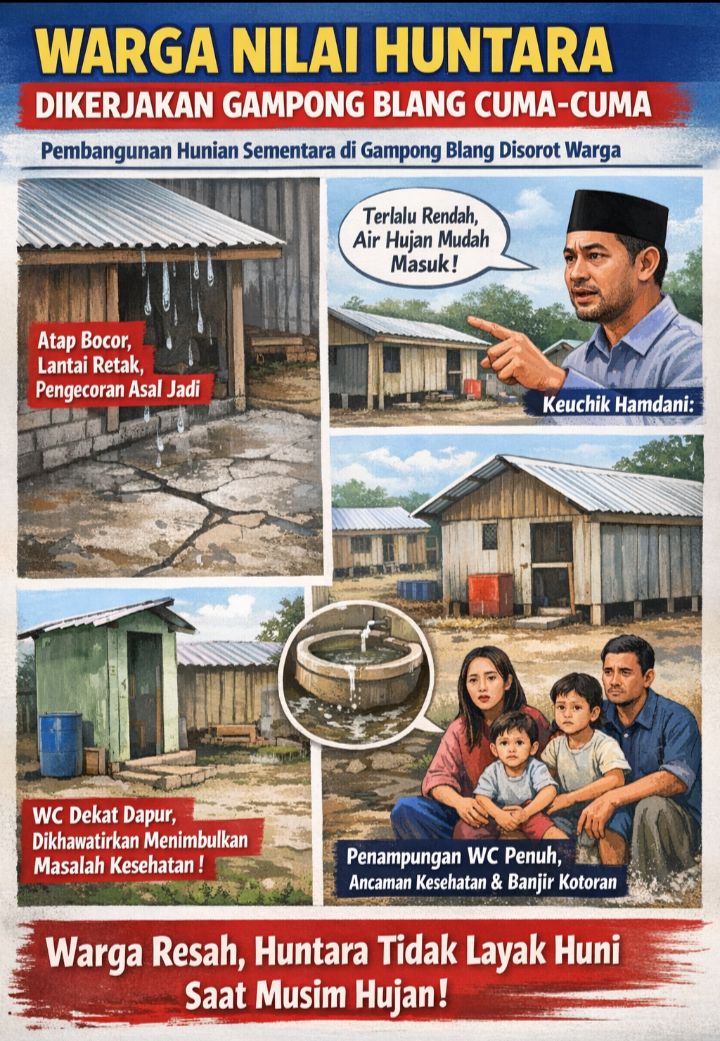 TLii|Aceh|Lhoksukon – Hunian sementara di kawasan pemukiman warga Gampong Blang kecamatan langkahan disorot,warga menilai vendor yang melakukan dugaan pekerjaan secara cuma-cuma hanya untuk mencari keuntungan diatas kesulitan warga.