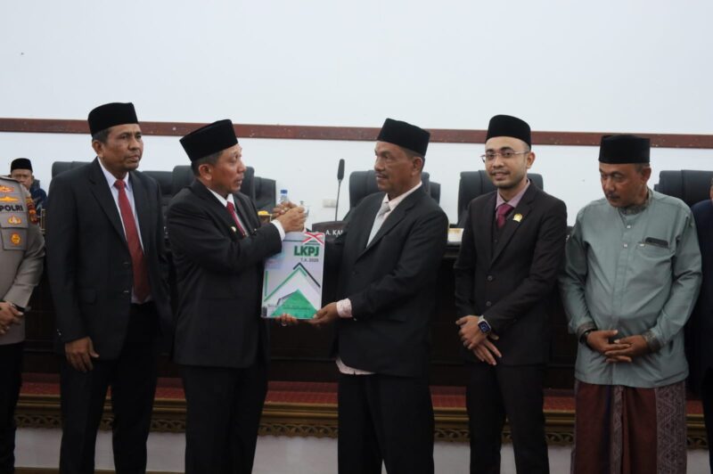 TLii..Bupati Pidie Jaya H. Sibral Malasyi MA, S.Soso, ME didampingi Wakilnya Hasan Basri, ST.MM, Para Forkompinda, Sekretaris Daerah Dr.Munawar Ibrahim, S.KP.M.PH, Para Asisten, Para Staf Ahli Bupati, Kepala SKPK dan unsur terkaitnya lainnya menyampaikan Laporan Keterangan Pertanggungjawaban (LKPJ) Kepala Daerah Tahun Anggaran 2025 dalam rapat paripurna DPRD sebagai bagian dari kewajiban konstitusional kepala daerah dalam melaporkan hasil penyelenggaraan pemerintahan, pembangunan, dan pelayanan publik selama satu tahun anggaran. Penyampaian LKPJ juga menjadi ruang evaluasi bersama antara eksekutif dan legislatif terhadap capaian pembangunan daerah.