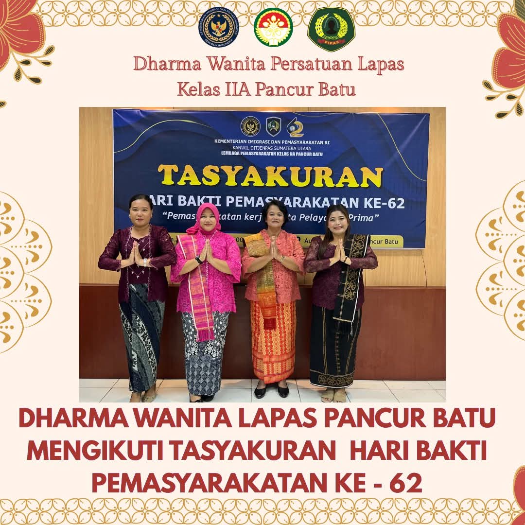 TIMELINES INEWS INVESTIGASI, Pancur Batu, 27 April 2026 Dalam rangka memperingati Hari Bakti Pemasyarakatan (HBP) ke-62 tahun 2026, Dharma Wanita Persatuan (DWP) Lembaga Pemasyarakatan (Lapas) Kelas IIA Pancur Batu turut berpartisipasi dalam kegiatan tasyakuran yang mengusung semangat kebersamaan dan kepedulian sosial.
