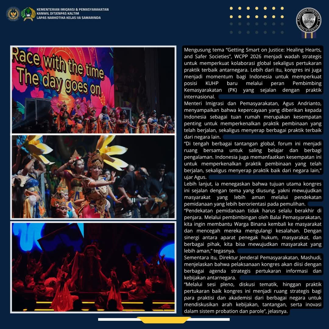 Mengusung tema “Getting Smart on Justice: Healing Hearts, and Safer Societies”, WCPP 2026 menjadi wadah strategis untuk memperkuat kolaborasi global sekaligus pertukaran praktik terbaik antarnegara. Lebih dari itu, kongres ini juga menjadi momentum bagi Indonesia untuk memperkuat posisi KUHP baru melalui peran Pembimbing Kemasyarakatan (PK) yang sejalan dengan praktik internasional.