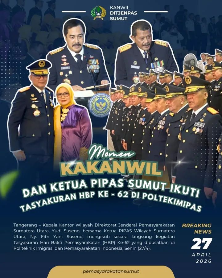 TIMELINES INEWS INVESTIGASI, Tangerang, Kepala Kantor Wilayah Direktorat Jenderal Pemasyarakatan Sumatera Utara, Yudi Suseno, bersama Ketua PIPAS Wilayah Sumatera Utara, Ny. Fitri Yani Suseno, mengikuti secara langsung kegiatan Tasyakuran Hari Bakti Pemasyarakatan (HBP) Ke-62 yang dipusatkan di Politeknik Imigrasi dan Pemasyarakatan Indonesia, Senin (27/4).