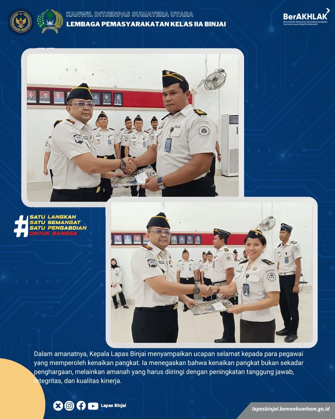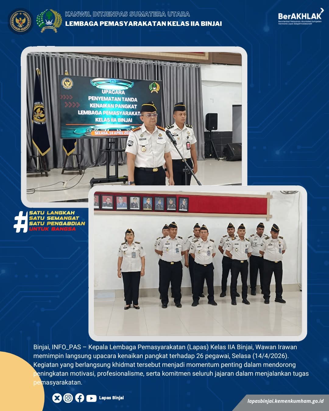 TIMELINES INEWS INVESTIGASI, Binjai Kepala Lembaga Pemasyarakatan Kelas IIA Binjai, Wawan Irawan, memimpin langsung upacara kenaikan pangkat terhadap 26 pegawai, Selasa (14/4/2026).