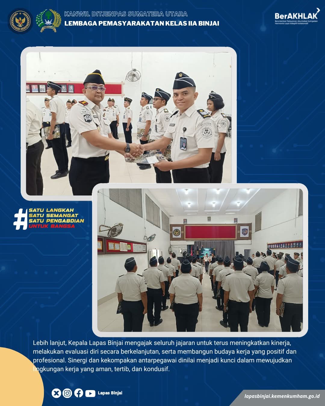 Lebih lanjut, Kalapas Binjai mengajak seluruh jajaran untuk terus meningkatkan kinerja, melakukan evaluasi diri secara berkelanjutan, serta membangun budaya kerja yang positif dan profesional. Sinergi dan kekompakan antarpegawai dinilai menjadi kunci dalam mewujudkan lingkungan kerja yang aman, tertib, dan kondusif.