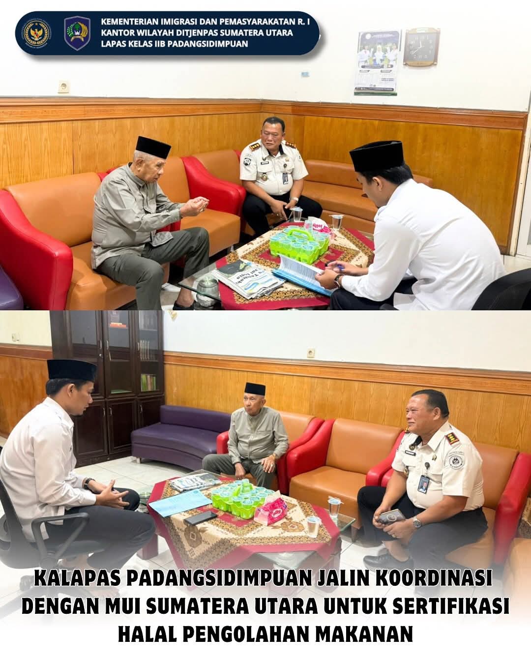 TIMELINES INEWS INVESTIGASI, Padangsidimpuan Kepala Lembaga Pemasyarakatan (Kalapas) Padangsidimpuan, Mathrios Zulhidayat Hutasoit, melakukan langkah strategis dengan menjalin koordinasi dan silaturahmi ke Majelis Ulama Indonesia (MUI) Sumatera Utara dalam rangka mendorong sertifikasi halal pada pengolahan makanan di Lapas Padangsidimpuan.