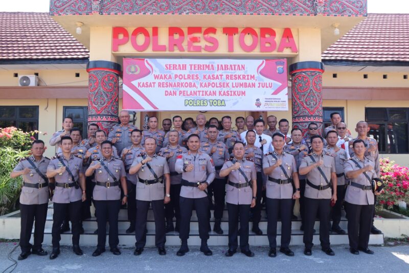 TLii | Sumut | Toba  – Kapolres Toba AKBP V.J. Parapaga, S.I.K memimpin langsung kegiatan Serah Terima Jabatan (Sertijab) Wakapolres, Kasat Reskrim, Kasat Narkoba, Kapolsek Lumban Julu serta pelantikan Kasikum Polres Toba, yang berlangsung dengan khidmat dan penuh semangat pembaruan organisasi , Kamis (16/04/26).