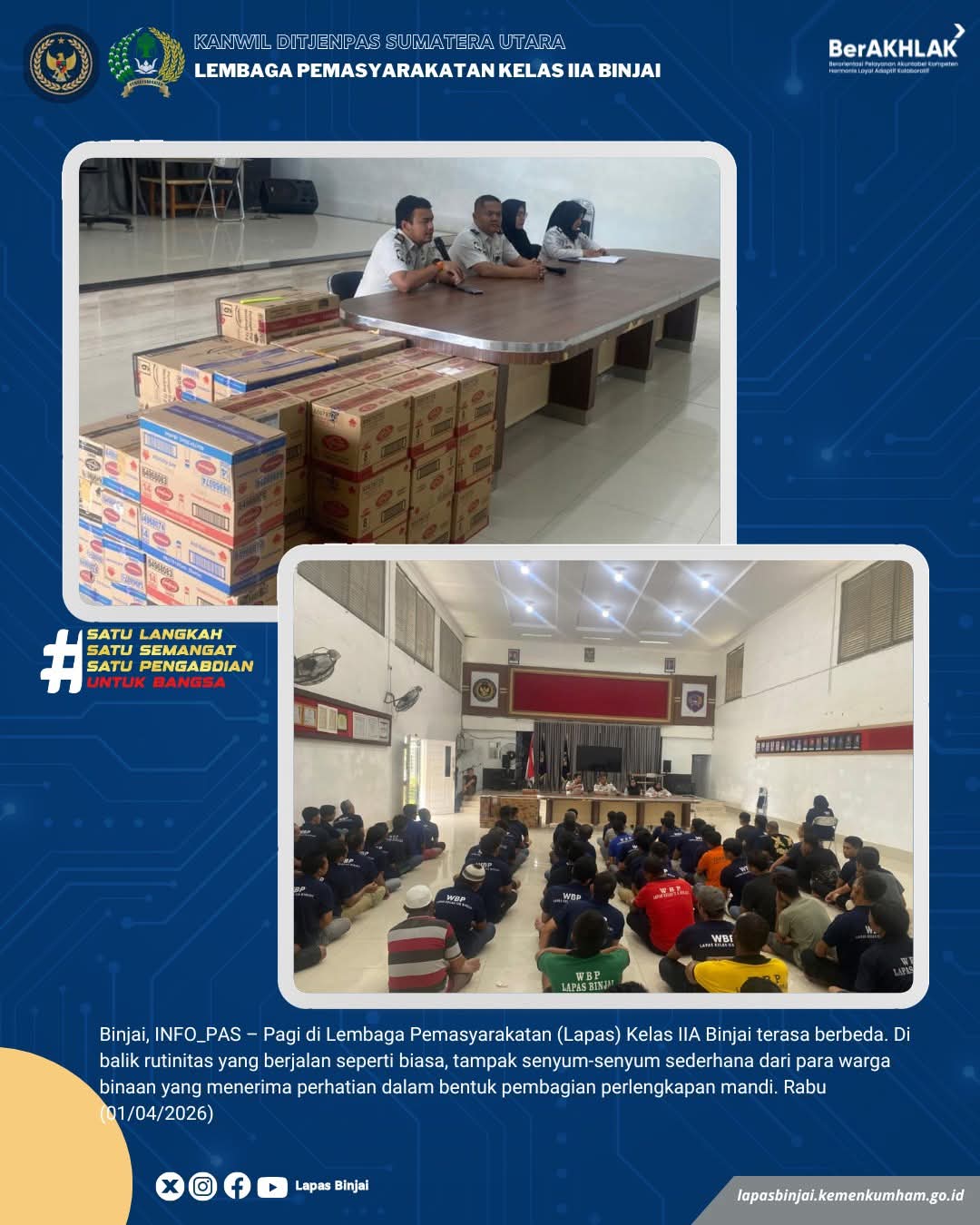 TIMELINES INEWS INVESTIGASI, Binjai Suasana pagi di Lembaga Pemasyarakatan (Lapas) Kelas IIA Binjai terasa berbeda pada Rabu (01/04/2026). Di balik aktivitas yang berjalan seperti biasa, tampak senyum para warga binaan saat menerima pembagian perlengkapan mandi dari petugas lapas.