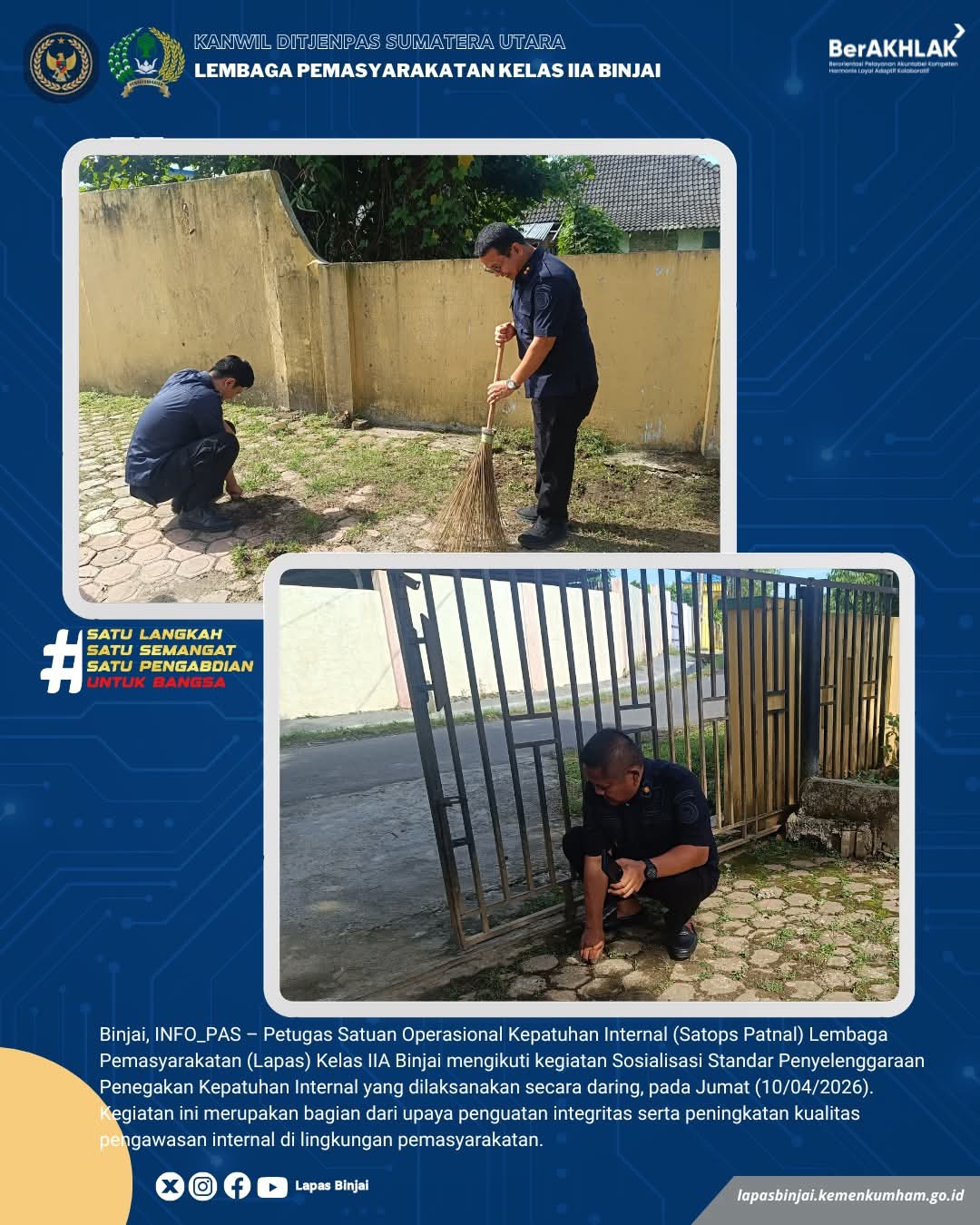 TIMELINES INEWS INVESTIGASI, Binjai Dalam rangka memperingati Hari Bakti Pemasyarakatan (HBP) ke-62 Tahun 2026, Lembaga Pemasyarakatan Kelas IIA Binjai menggelar kegiatan bakti sosial berupa aksi bersih-bersih sarana dan fasilitas umum, Sabtu (11/04/2026). Kegiatan ini dilaksanakan sebagai bentuk kepedulian terhadap kebersihan tempat umum di lingkungan sekitar Lapas.