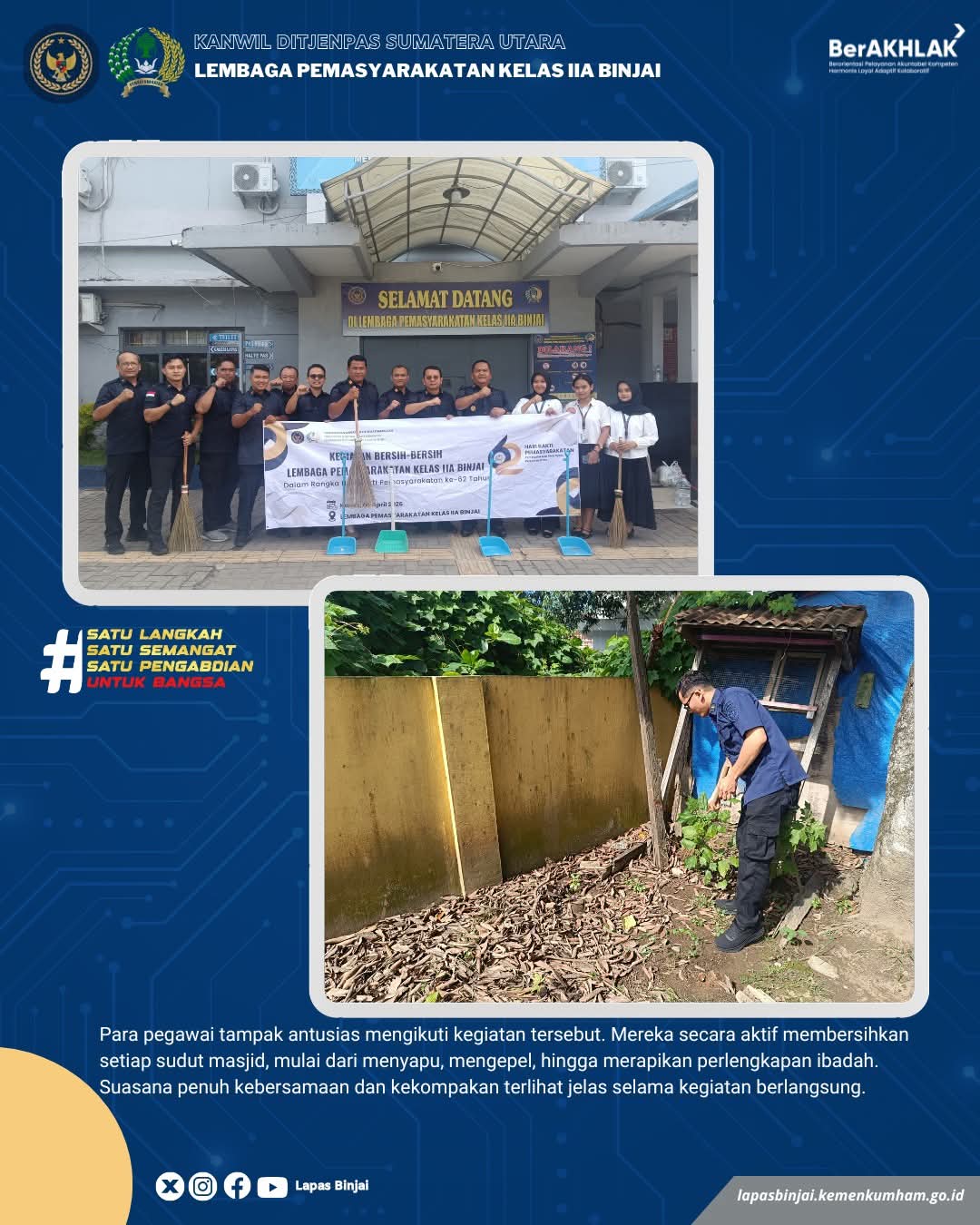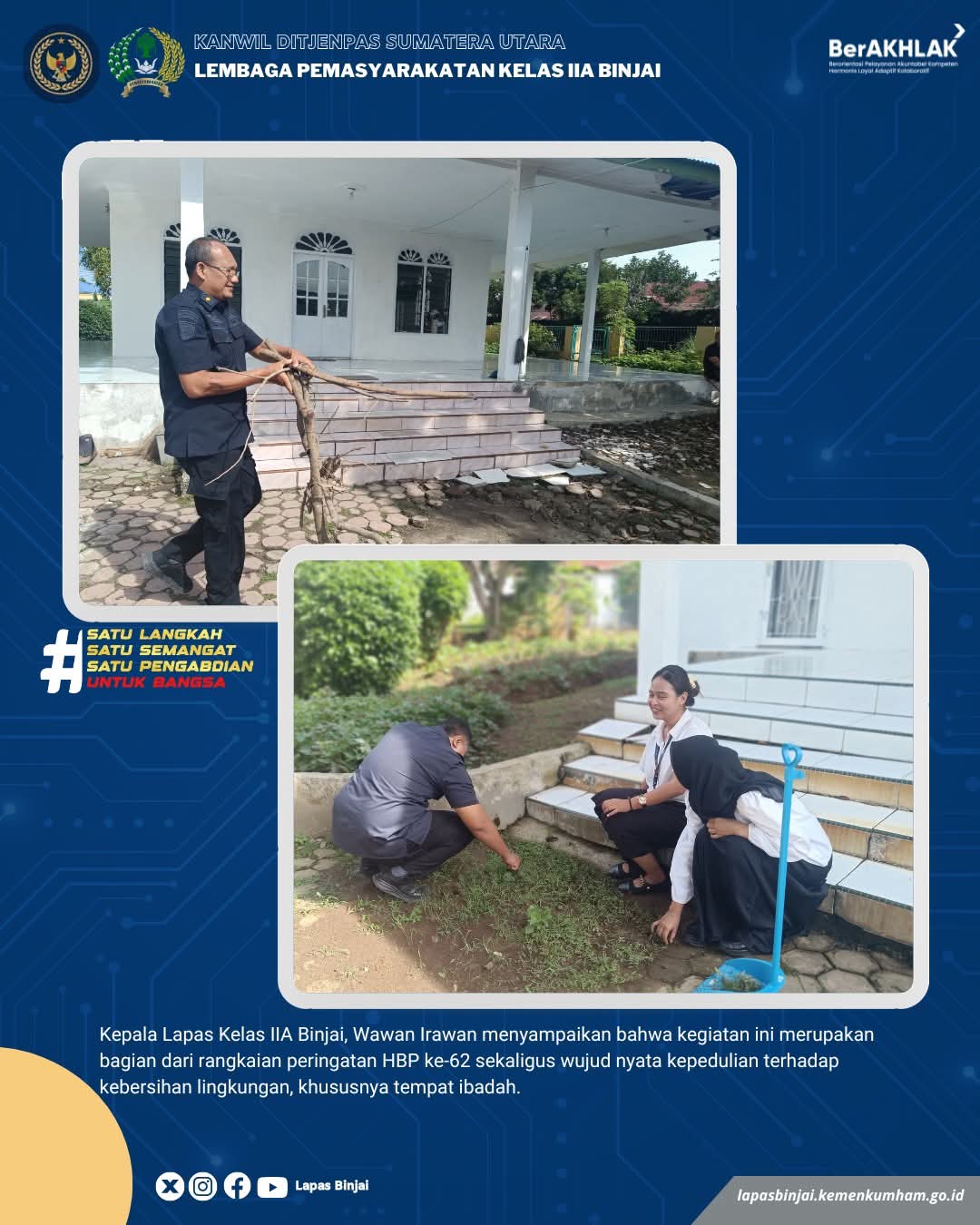 Kepala Lembaga Pemasyarakatan Kelas IIA Binjai, Wawan Irawan menyampaikan bahwa kegiatan ini merupakan bagian dari rangkaian peringatan HBP ke-62 sekaligus wujud nyata kepedulian terhadap kebersihan lingkungan, khususnya tempat ibadah.