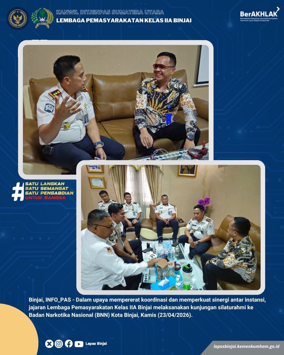 TIMELINES INEWS INVESTIGASI, Binjai Dalam upaya mempererat koordinasi dan memperkuat sinergi antarinstansi, Lembaga Pemasyarakatan (Lapas) Kelas IIA Binjai melaksanakan kunjungan silaturahmi ke Badan Narkotika Nasional Kota Binjai pada Kamis (23/04/2026).
