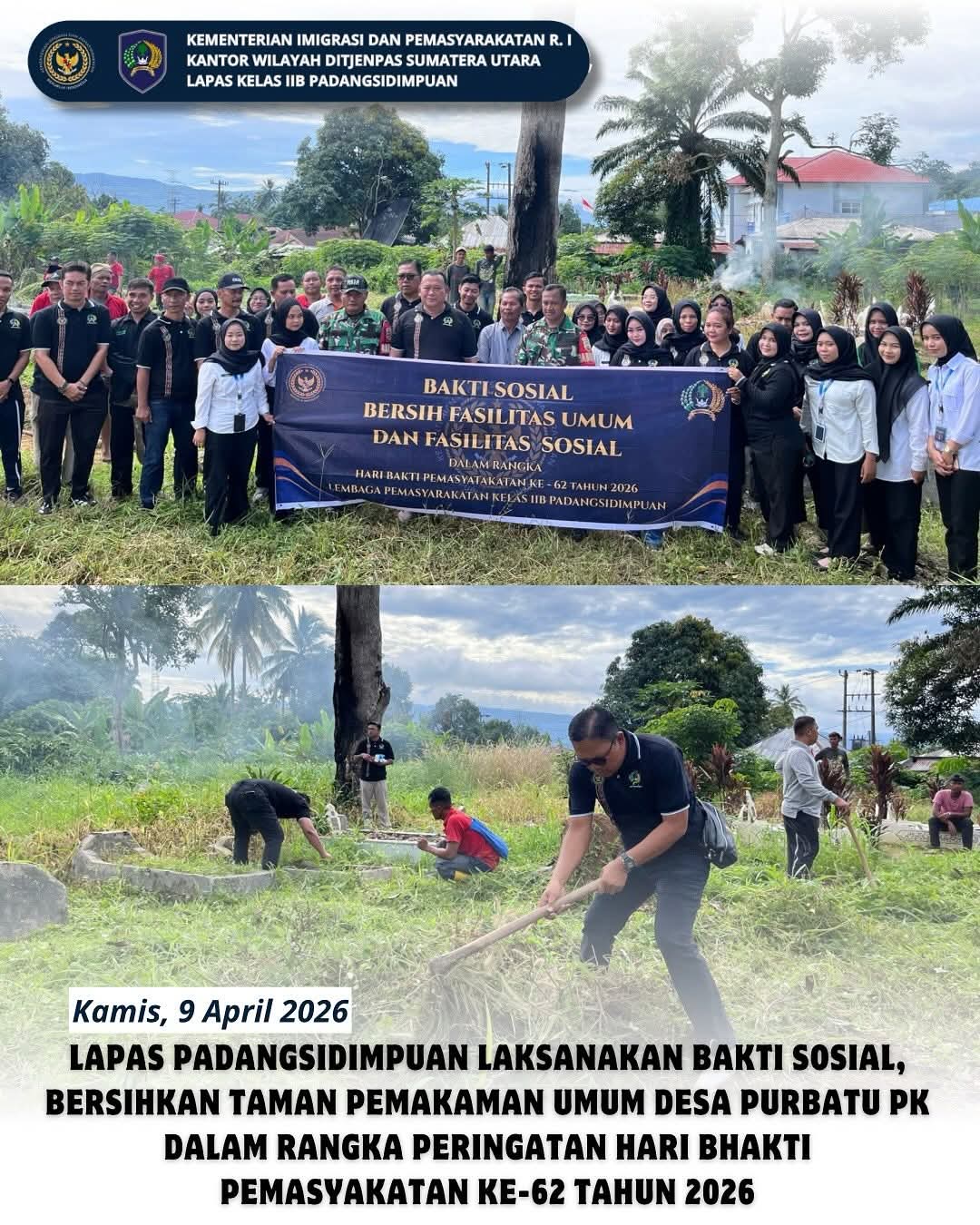 Kegiatan tersebut dilaksanakan di area Taman Pemakaman Umum (TPU) Desa Purbatu Pijorkoling pada Rabu (8/4/2026). Dalam kegiatan ini, jajaran Lapas melakukan pembersihan area pemakaman, merapikan lingkungan sekitar, serta menata fasilitas umum guna menciptakan lingkungan yang bersih, asri, dan nyaman.