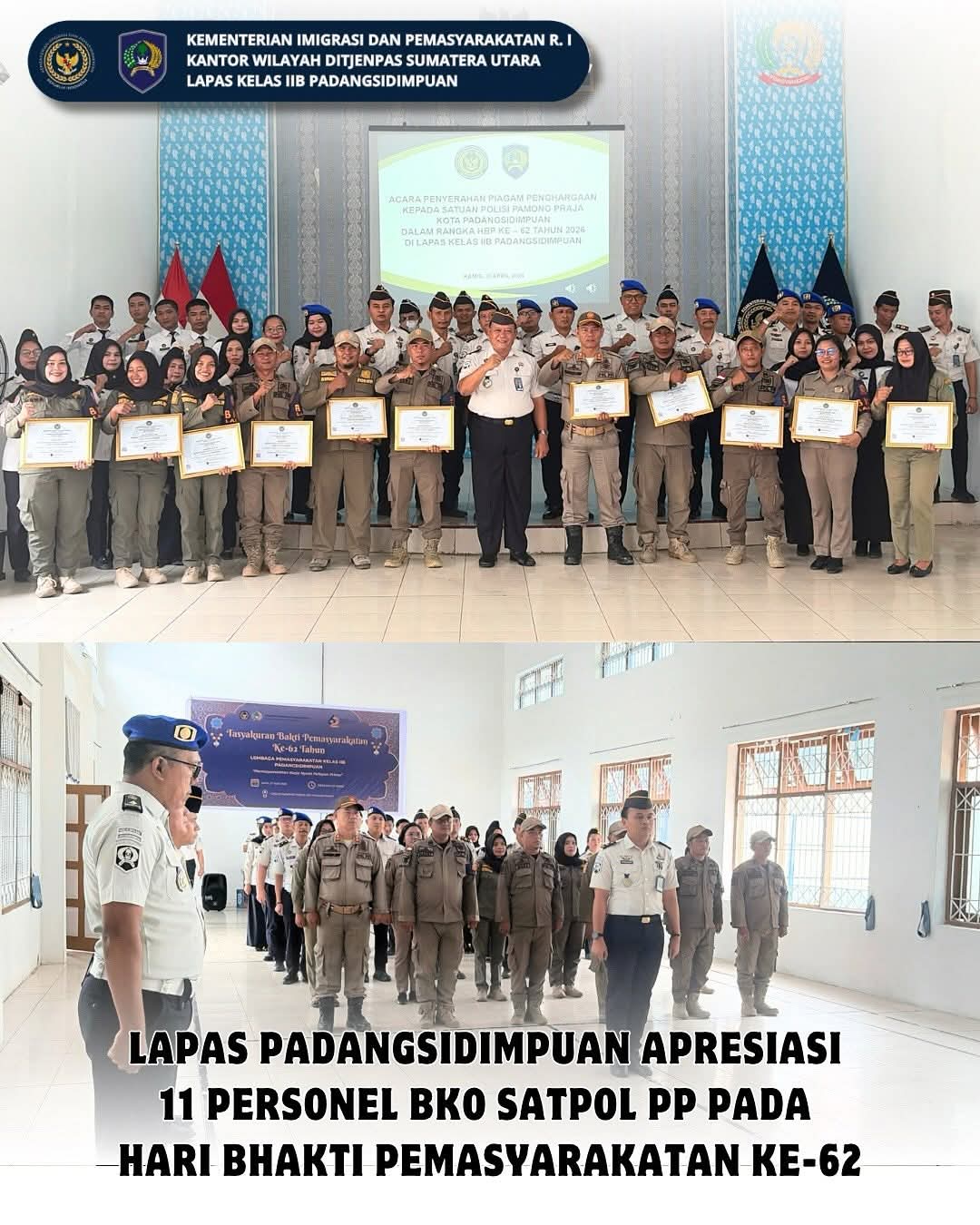TIMELINES INEWS INVESTIGASI, Padangsidimpuan, Dalam rangkaian peringatan Hari Bhakti Pemasyarakatan ke-62, Lembaga Pemasyarakatan (Lapas) Kelas IIB Padangsidimpuan memberikan penghargaan kepada 11 personel Satuan Polisi Pamong Praja (Satpol PP) Kota Padangsidimpuan yang bertugas sebagai Bawah Kendali Operasi (BKO) di Lapas Padangsidimpuan, Kamis (30/04/2026)