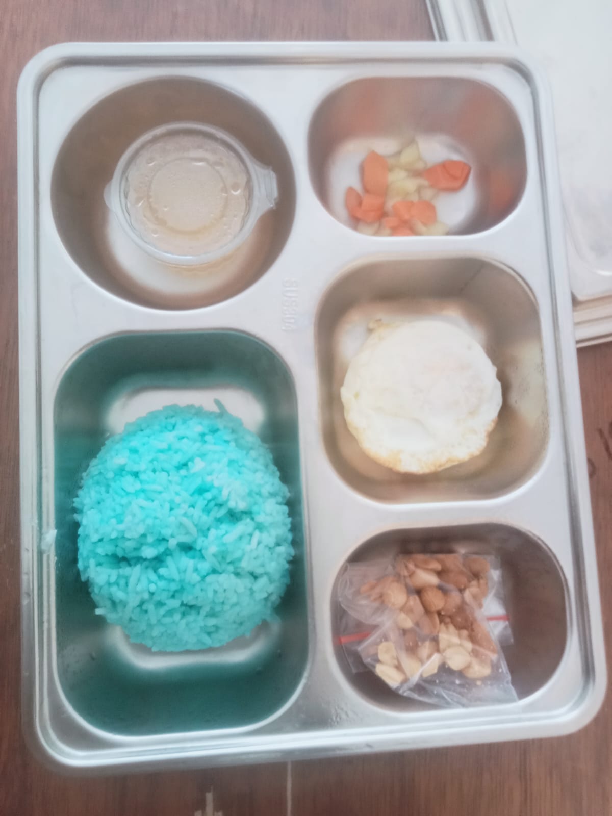 Menu MBG hari Selasa(28/04/26) di SDN Ule Jalan, Nasi berwarna biru, sayur acar basi. Wali murid Resah.