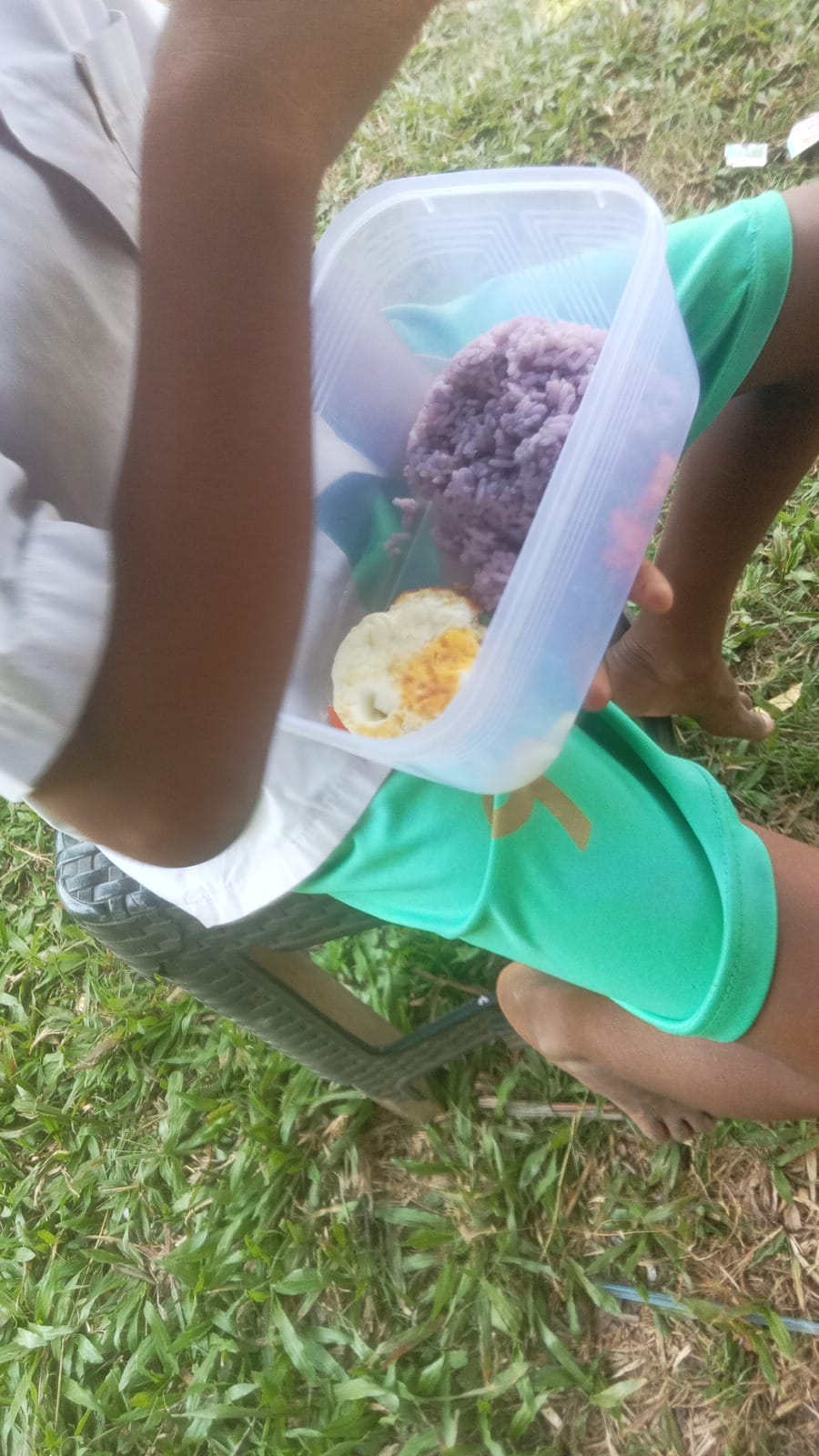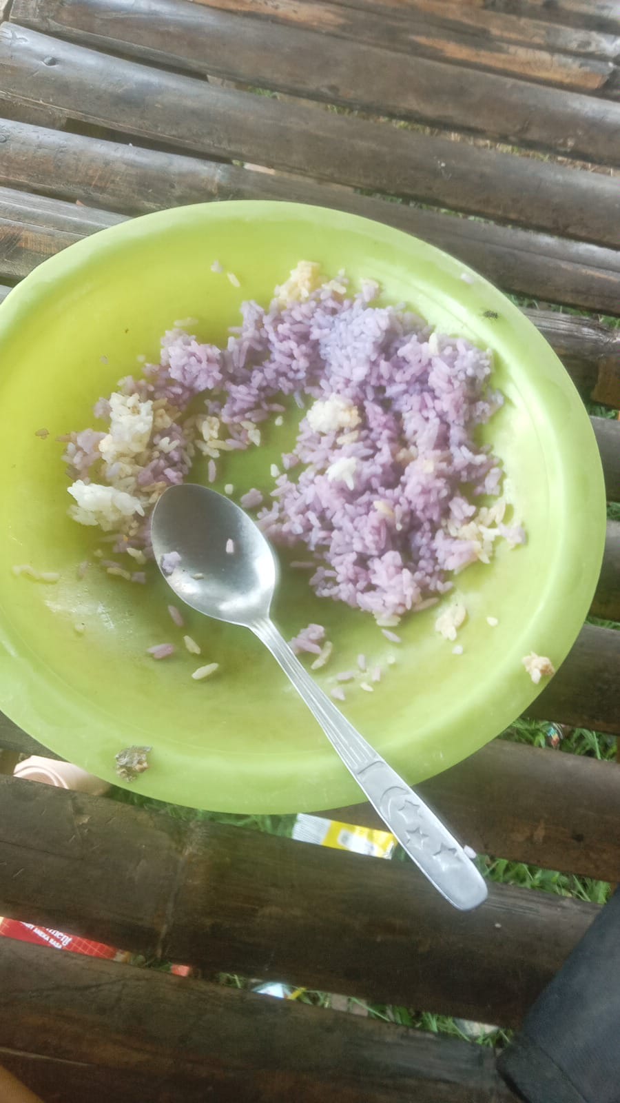 Nasi berwarna ungu di Salah satu SD Desa Hagu Barat Laut, nasi tersebut dibawa pulang siswa kerumahnya.