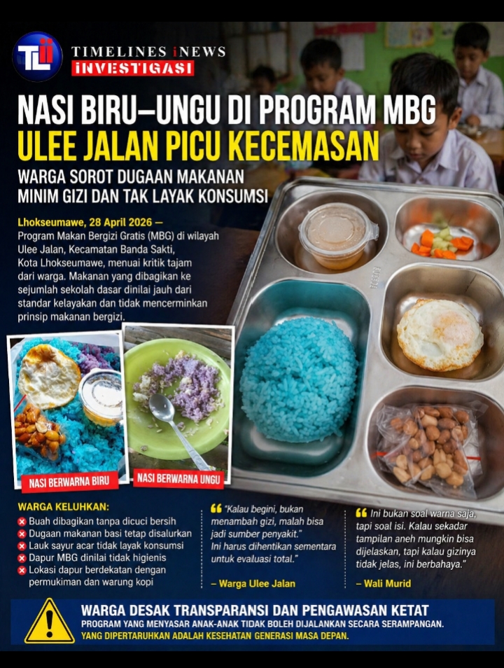 Lhokseumawe, 28 April 2026 — Program Makan Bergizi Gratis (MBG) yang digadang-gadang menjadi solusi peningkatan asupan gizi siswa justru menuai kritik tajam di wilayah Ulee Jalan, Kecamatan Banda Sakti, Kota Lhokseumawe. Distribusi makanan ke sejumlah sekolah dasar dikeluhkan warga karena dinilai jauh dari standar kelayakan—bahkan disebut tidak mencerminkan prinsip makanan bergizi.