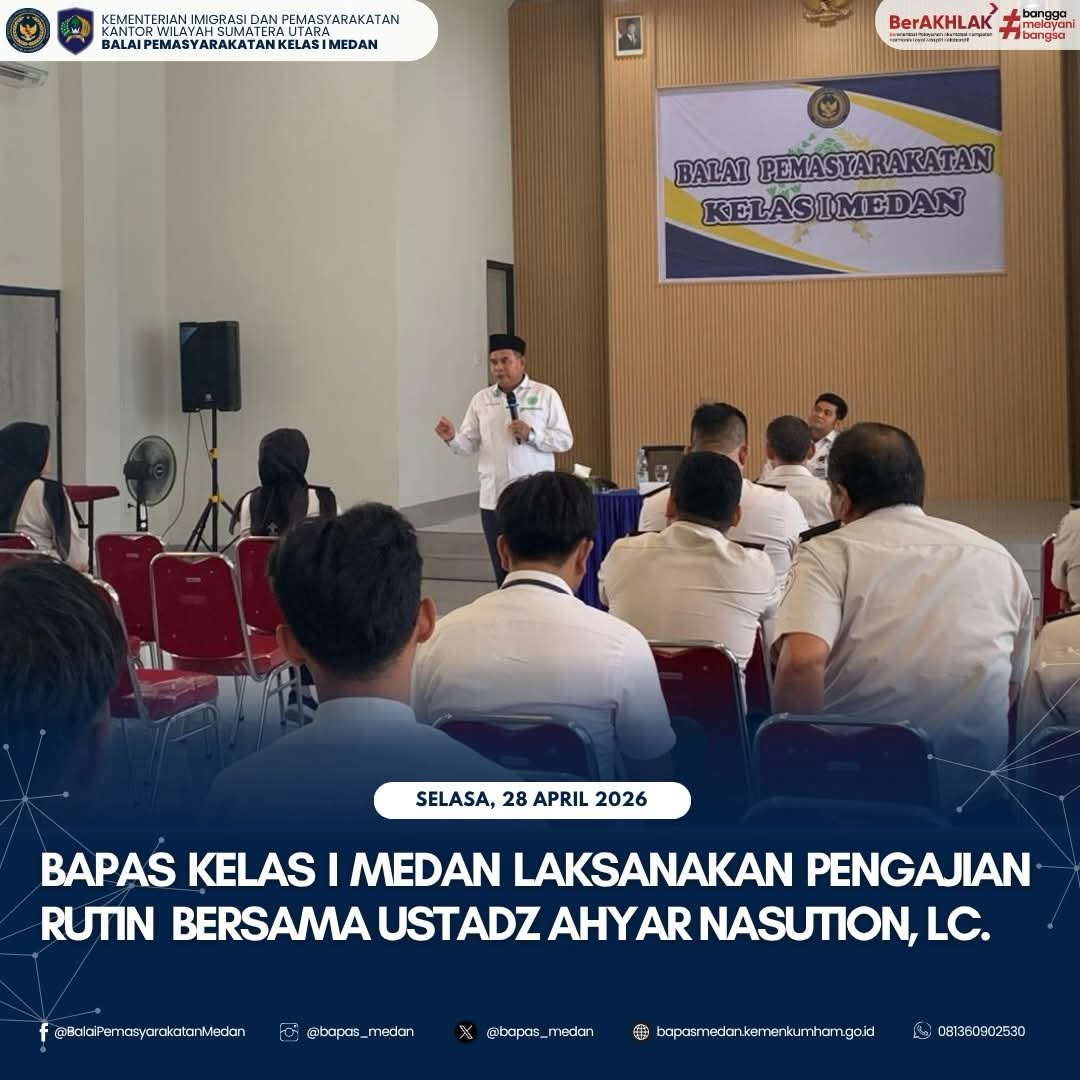 TIMELINES INEWS INVESTIGASI, Medan, 28 April 2026 Balai Pemasyarakatan (Bapas) Kelas I Medan menggelar kegiatan pengajian rutin yang berlangsung khidmat di aula Bapas Kelas I Medan. Kegiatan ini diikuti oleh seluruh jajaran pegawai beragama Muslim sebagai bagian dari upaya pembinaan mental dan spiritual aparatur sipil negara.