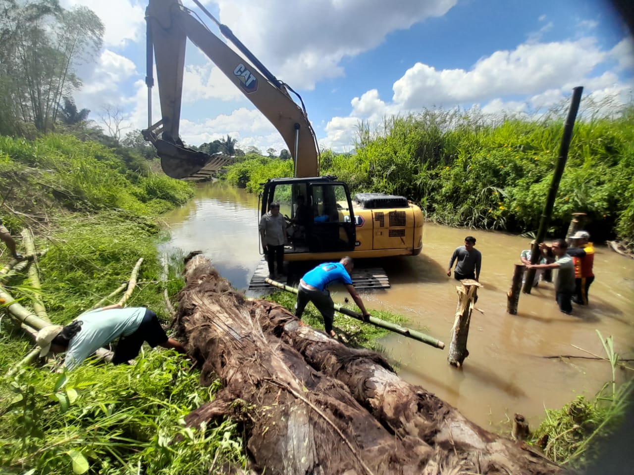 Pengerjaan ini bertujuan menaikkan permukaan air sungai agar bisa masuk kembali ke saluran irigasi dan mengairi lahan persawahan warga.