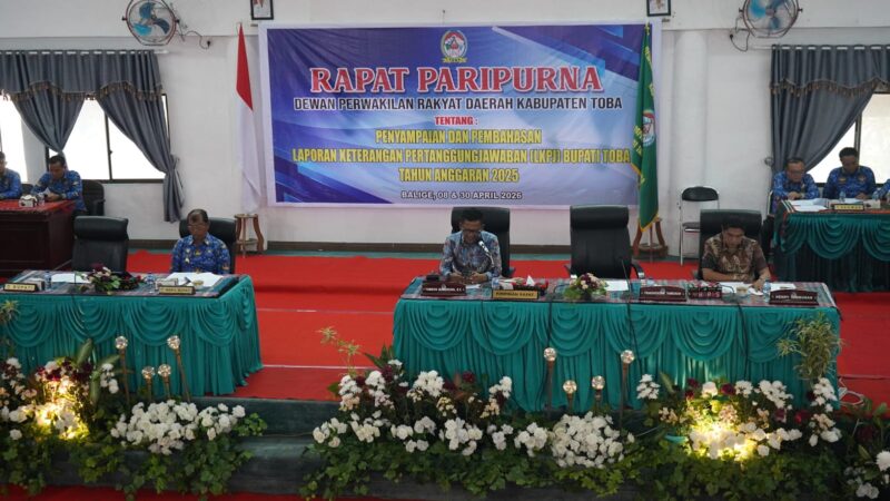 TLii | Sumut | Toba – Dewan Perwakilan Rakyat Daerah (DPRD) Kabupaten Toba menyampaikan rekomendasi terhadap Laporan Keterangan Pertanggungjawaban (LKPj) Bupati Toba Tahun Anggaran 2025 yang disampaikan dalam rapat paripurna DPRD Kabupaten Toba pada Kamis (30/4/2026) sore.