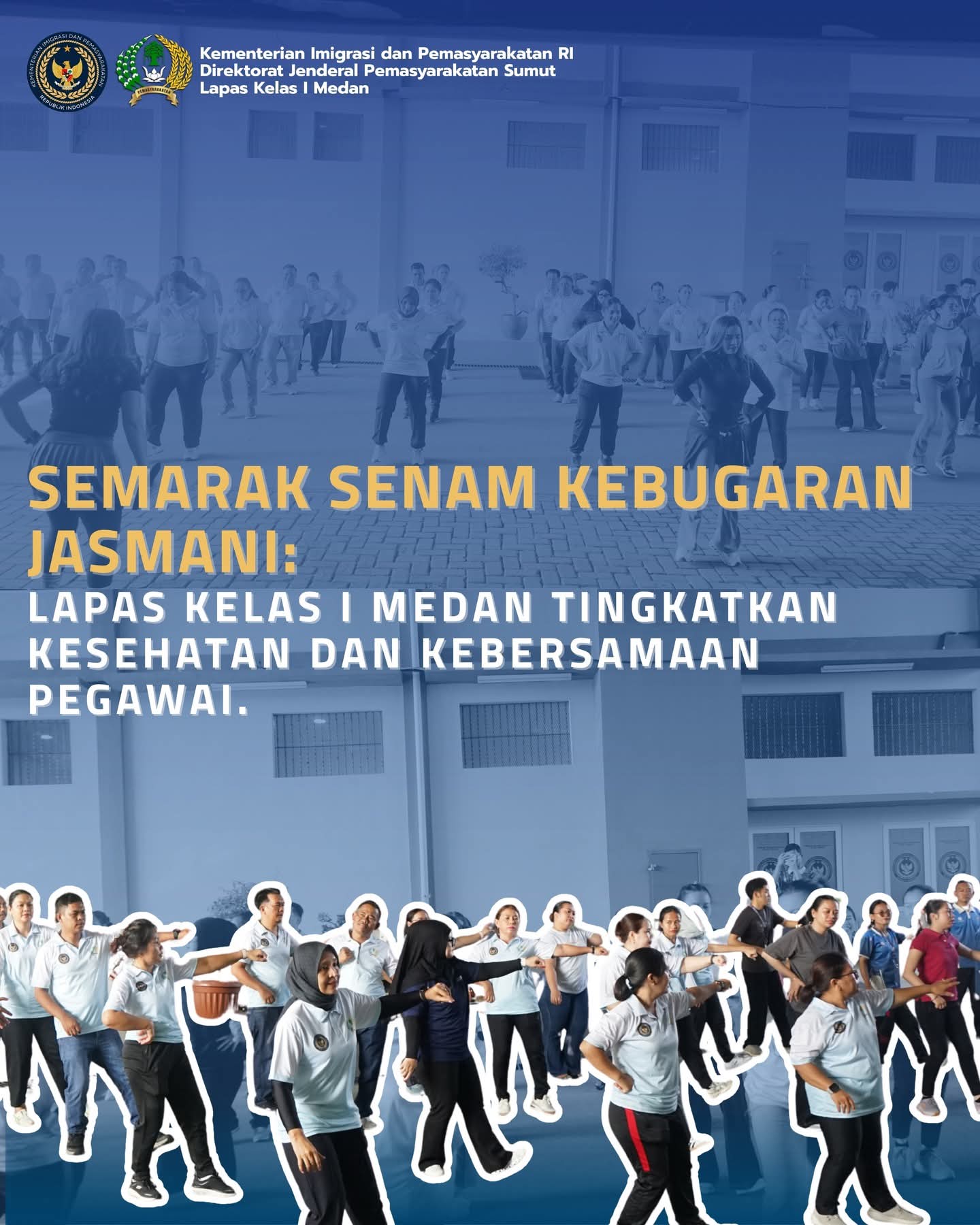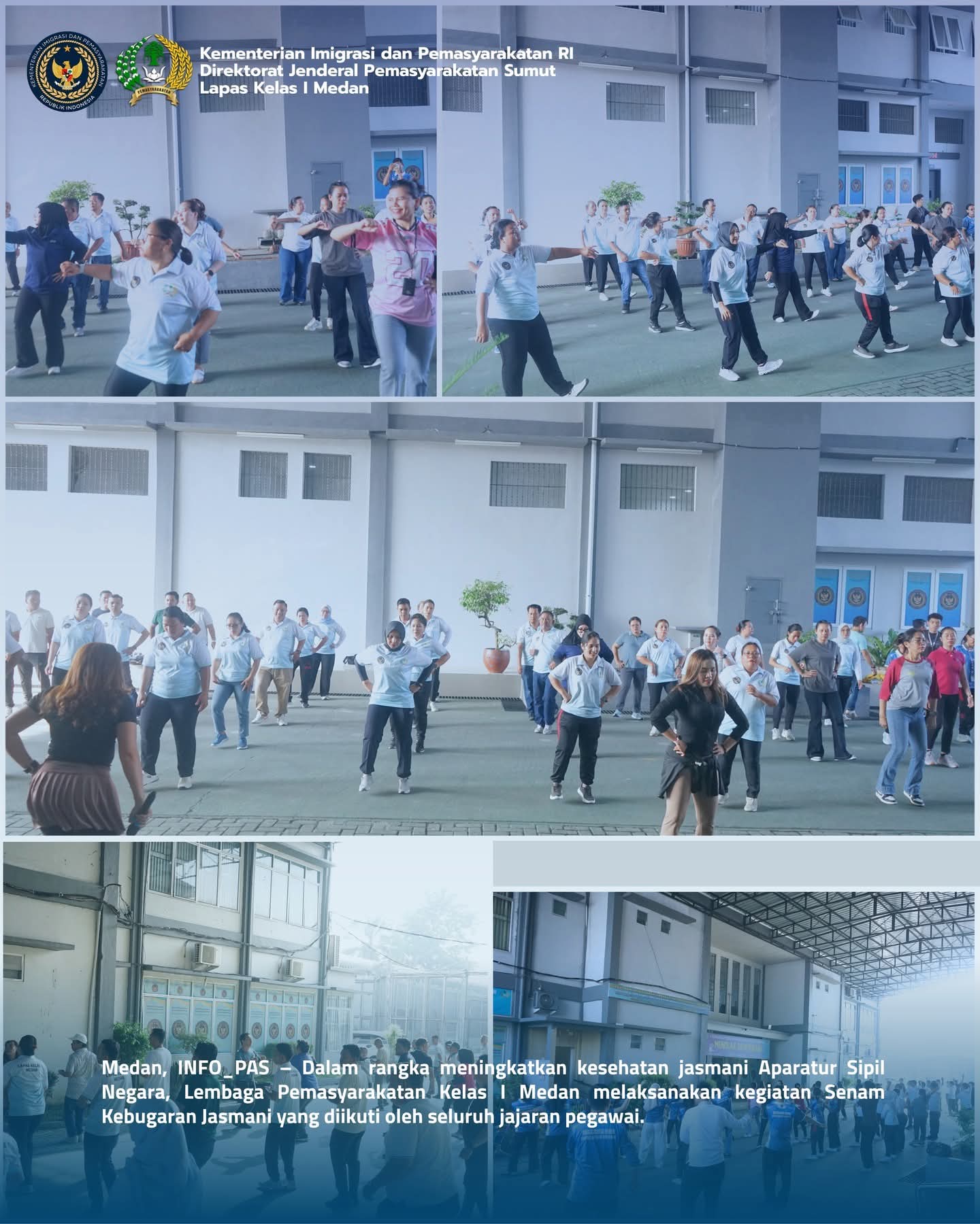 TIMELINES INEWS INVESTIGASI, Medan, Dalam rangka meningkatkan kesehatan jasmani Aparatur Sipil Negara, Lembaga Pemasyarakatan Kelas I Medan melaksanakan kegiatan Senam Kebugaran Jasmani yang diikuti oleh seluruh jajaran pegawai.