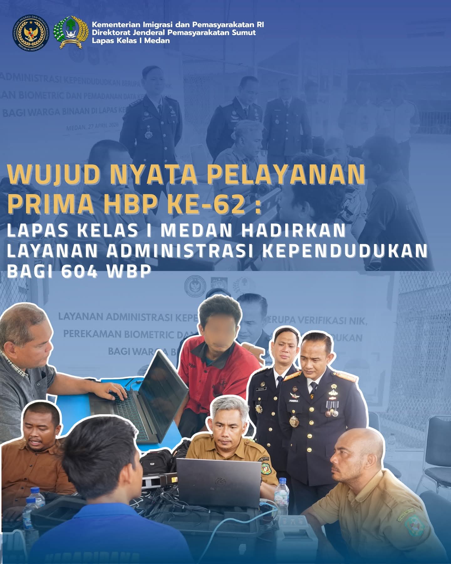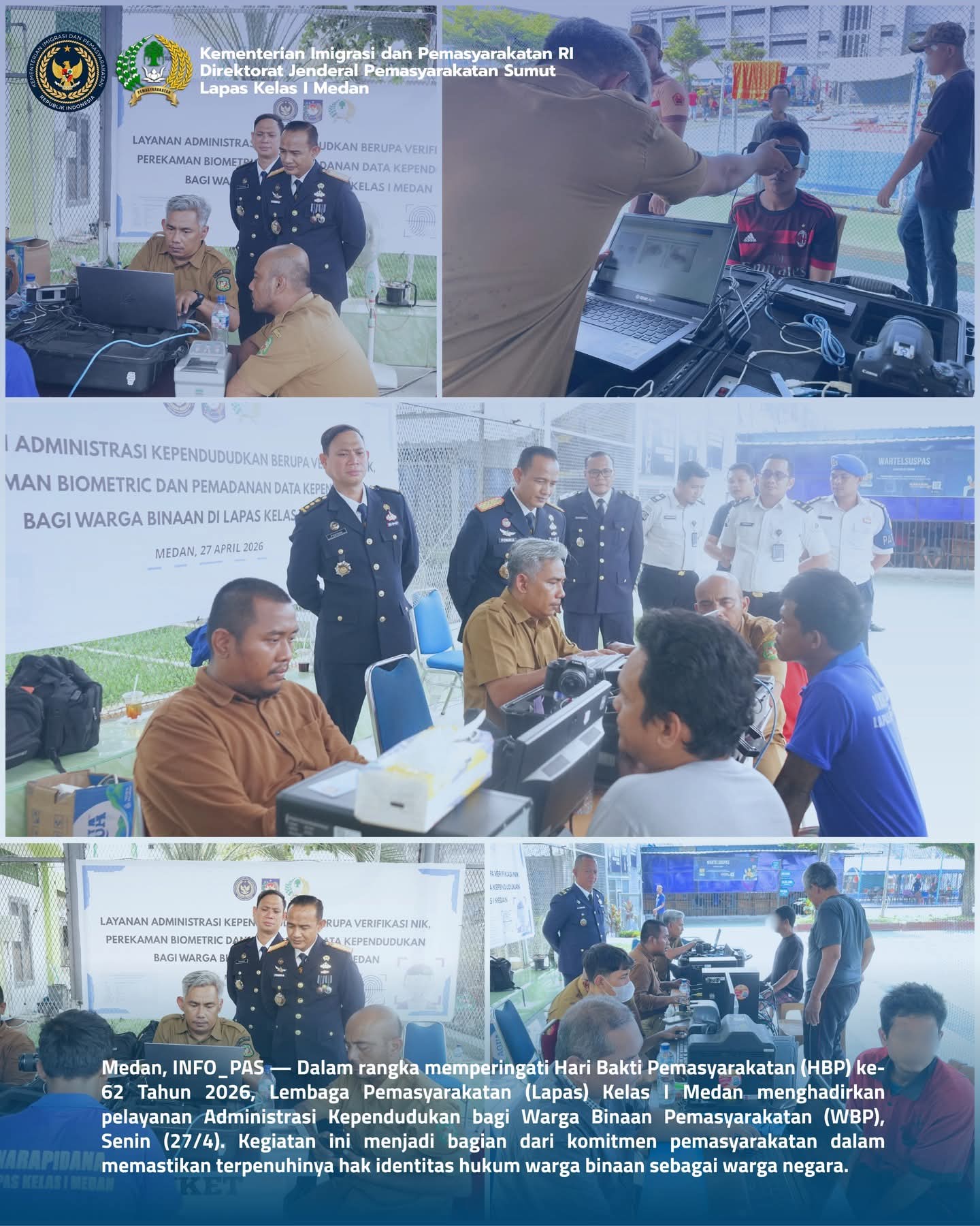 TIMELINES INEWS INVESTIGASI, Medan, Dalam rangka memperingati Hari Bakti Pemasyarakatan (HBP) ke-62 Tahun 2026, Lembaga Pemasyarakatan (Lapas) Kelas I Medan menghadirkan pelayanan Administrasi Kependudukan bagi Warga Binaan Pemasyarakatan (WBP), Senin (27/4). Kegiatan ini menjadi bagian dari komitmen pemasyarakatan dalam memastikan terpenuhinya hak identitas hukum warga binaan sebagai warga negara.