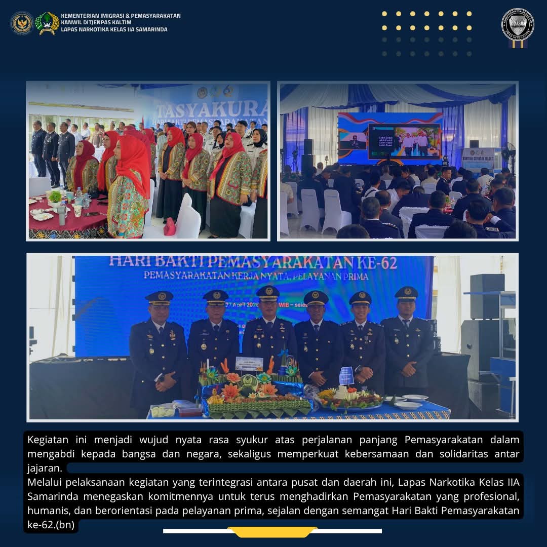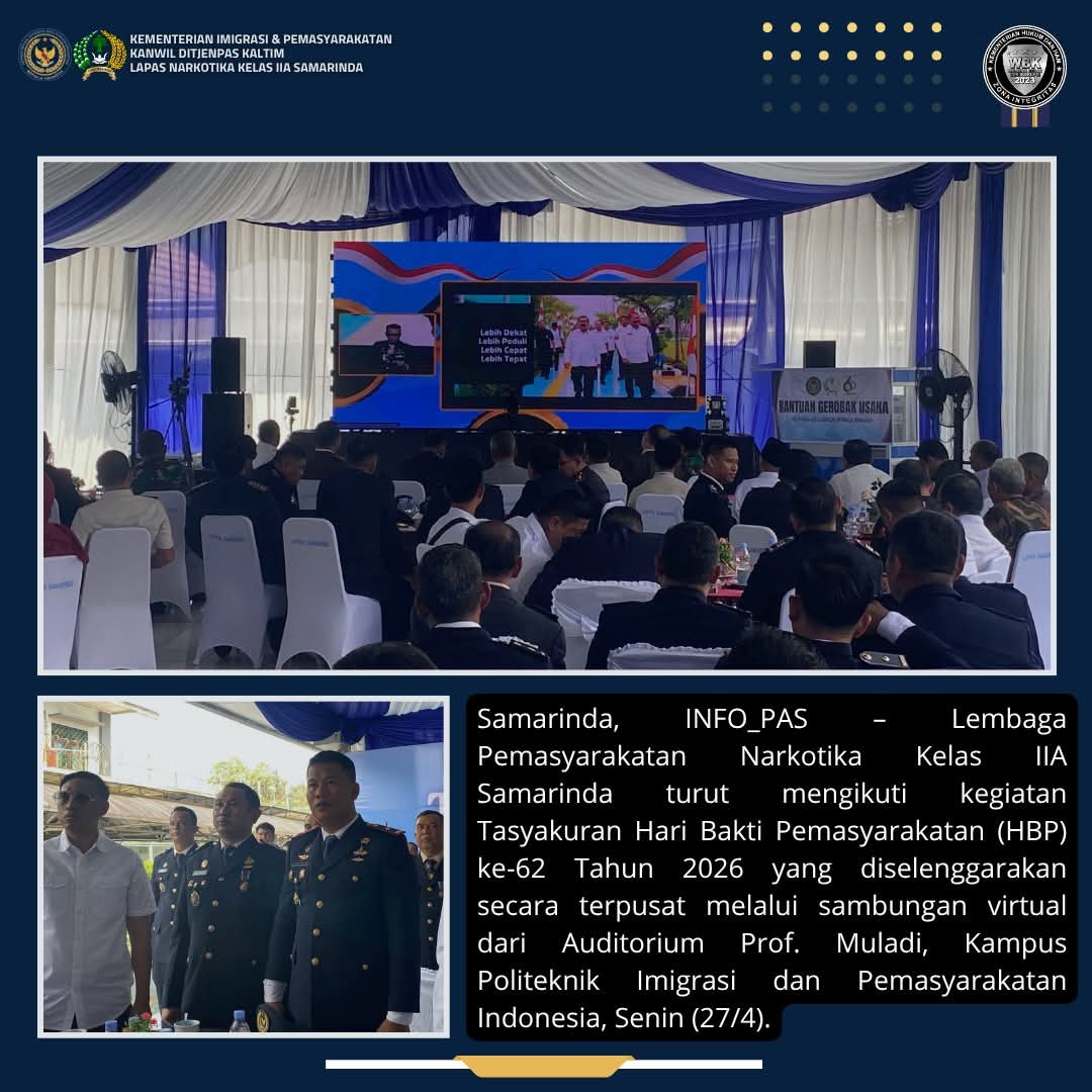 TIMELINES INEWS INVESTIGASI, Samarinda, Lembaga Pemasyarakatan Narkotika Kelas IIA Samarinda turut mengikuti kegiatan Tasyakuran Hari Bakti Pemasyarakatan (HBP) ke-62 Tahun 2026 yang diselenggarakan secara terpusat melalui sambungan virtual dari Auditorium Prof. Muladi, Kampus Politeknik Imigrasi dan Pemasyarakatan Indonesia, Senin (27/4).