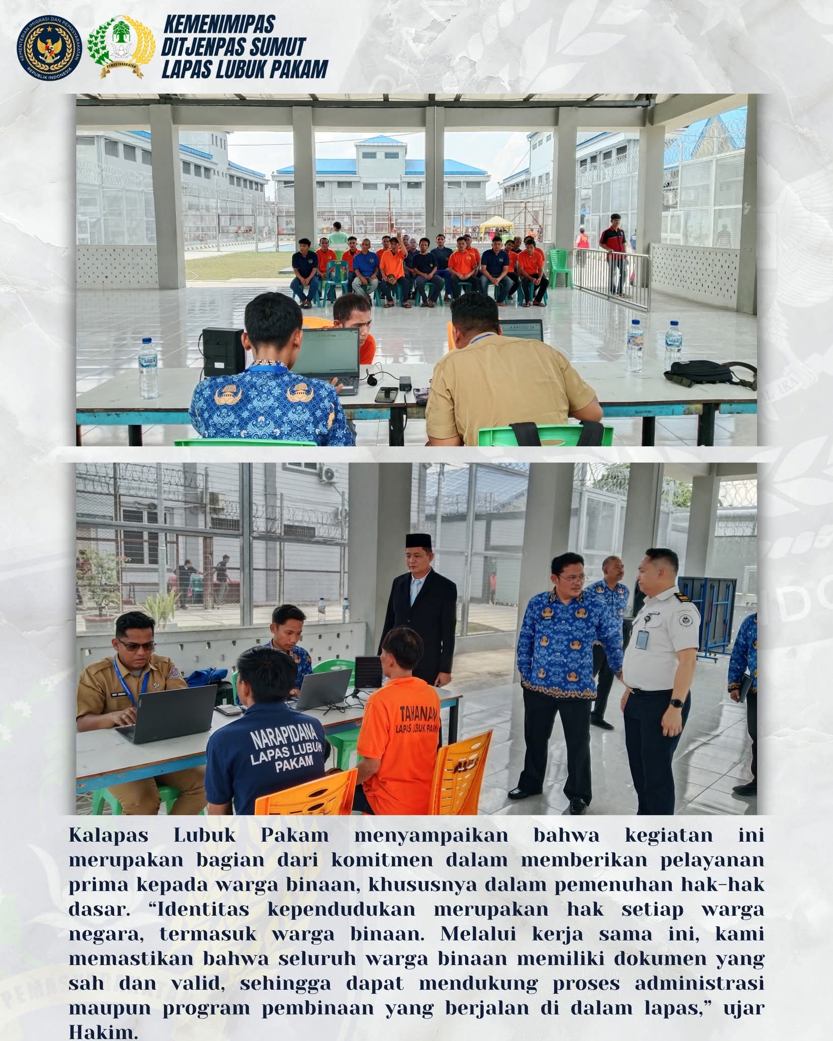 Dengan adanya kegiatan ini, diharapkan seluruh warga binaan di Lapas Lubuk Pakam dapat memiliki identitas kependudukan yang lengkap dan akurat, sehingga mempermudah berbagai proses administrasi baik selama menjalani masa pidana maupun setelah kembali ke masyarakat, Tegasnya.