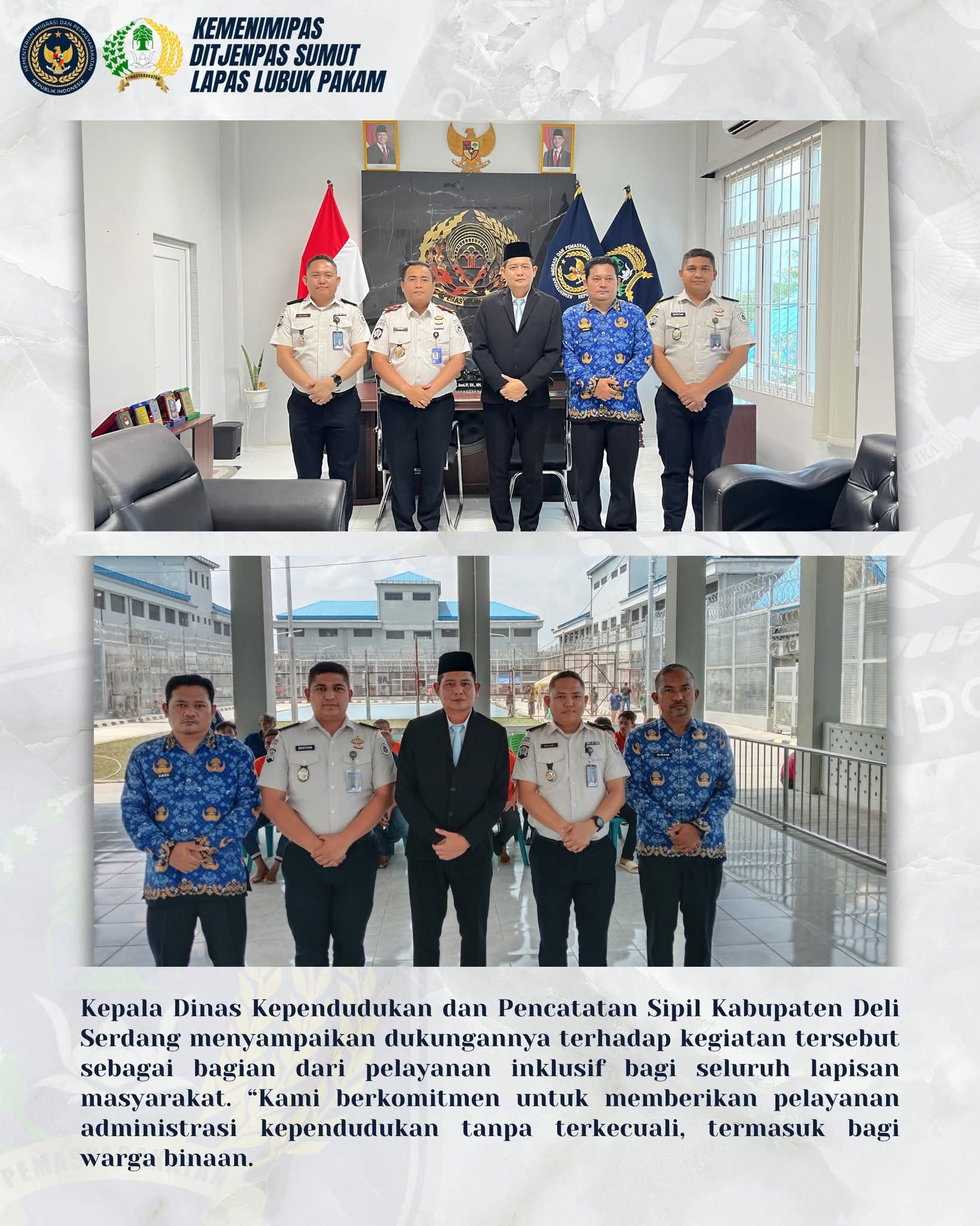 Sementara itu, Kepala Dinas Kependudukan dan Pencatatan Sipil Kabupaten Deli Serdang menyampaikan dukungannya terhadap kegiatan tersebut sebagai bagian dari pelayanan inklusif bagi seluruh lapisan masyarakat. “Kami berkomitmen untuk memberikan pelayanan administrasi kependudukan tanpa terkecuali, termasuk bagi warga binaan. Melalui kegiatan ini, kami memastikan bahwa mereka tetap mendapatkan hak identitas yang sah. Data kependudukan yang akurat sangat penting, baik untuk keperluan administrasi selama di dalam lapas maupun saat mereka kembali ke tengah masyarakat,” ungkap Danang.