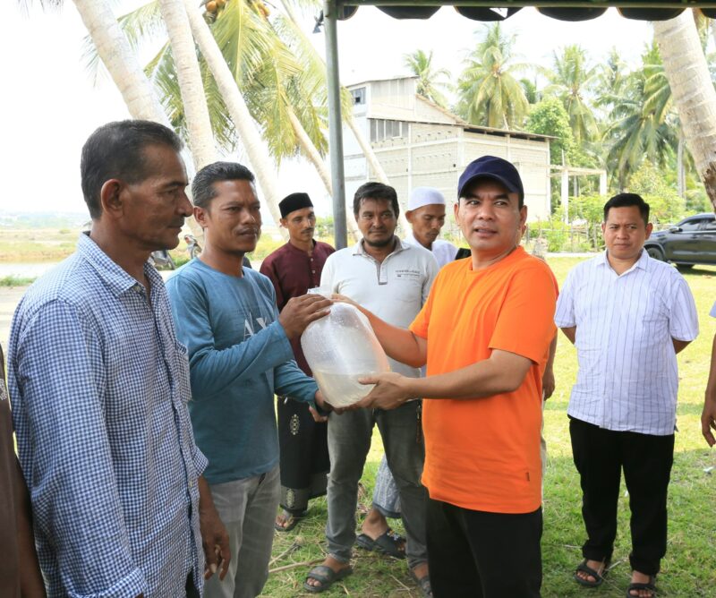TLii|Aceh|Lhokseumawe, 25 April 2026 — Wali Kota Lhokseumawe, Dr. Sayuti Abubakar, SH, MH bersama Ketua Forum Peningkatan Konsumsi Ikan (Forikan) Kota Lhokseumawe, Ny. Yulinda Sayuti, menyerahkan bantuan benur udang vaname kepada kelompok pembudidaya “Jak U Neuheun” di Gampong Tunong, Kecamatan Blang Mangat, Sabtu (25/4).