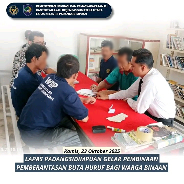 TIMELINES INEWS INVESTIGASI, Padangsidimpuan, Lapas Kelas IIB Padangsidimpuan melaksanakan kegiatan pembinaan khusus yang menyasar pemberantasan buta huruf di kalangan warga binaan, sebagai bagian dari komitmen pembinaan intelektual dan keterampilan dasar demi mendukung proses reintegrasi ke masyarakat, Kamis (23/10/2025)