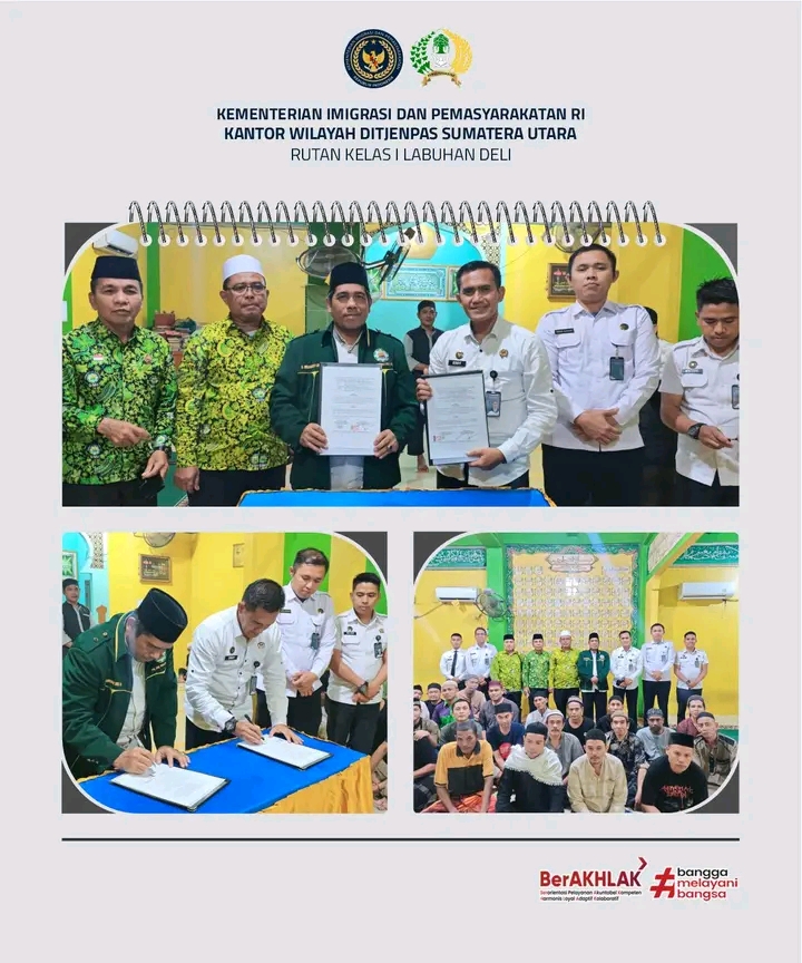TIMELINES INEWS INVESTIGASI, Labuhan Deli, 23 Oktober 2025 Dalam rangka memperkuat pembinaan mental, spiritual, serta peningkatan kualitas sumber daya manusia bagi warga binaan, Rumah Tahanan Negara (Rutan) Kelas I Labuhan Deli menjalin kerja sama dengan Dewan Masjid Indonesia (DMI) Wilayah Sumatera Utara melalui penandatanganan Nota Kesepahaman (MoU) tentang Penyelenggaraan Kegiatan Pembinaan, Pendidikan, dan Pelatihan bagi Warga Binaan.