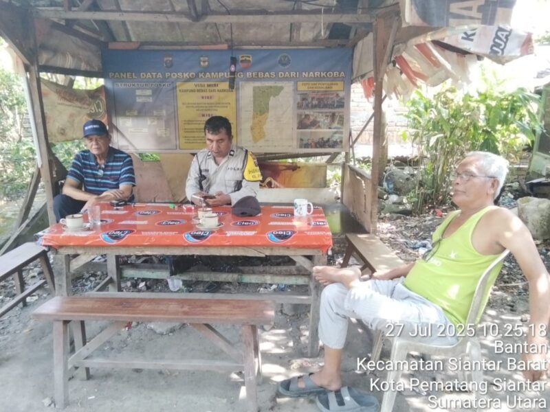 TLii|SUMUT|SIANTAR|Polsek Siantar Barat, Polres Pematangsiantar melalui Piket Bhabinkamtibmas AIPTU Alexander dan AIPTU Wellinton Nababan melaksanakan patroli di Posko Kampung Bebas dari Narkoba (KBN) yang terletak di jalan Jawa, Kelurahan Bantan, Kecamatan Siantar Barat, Kota Pematangsiantar, pada Minggu 27 Juli 2025 pagi pukul : 10.24 Wib.