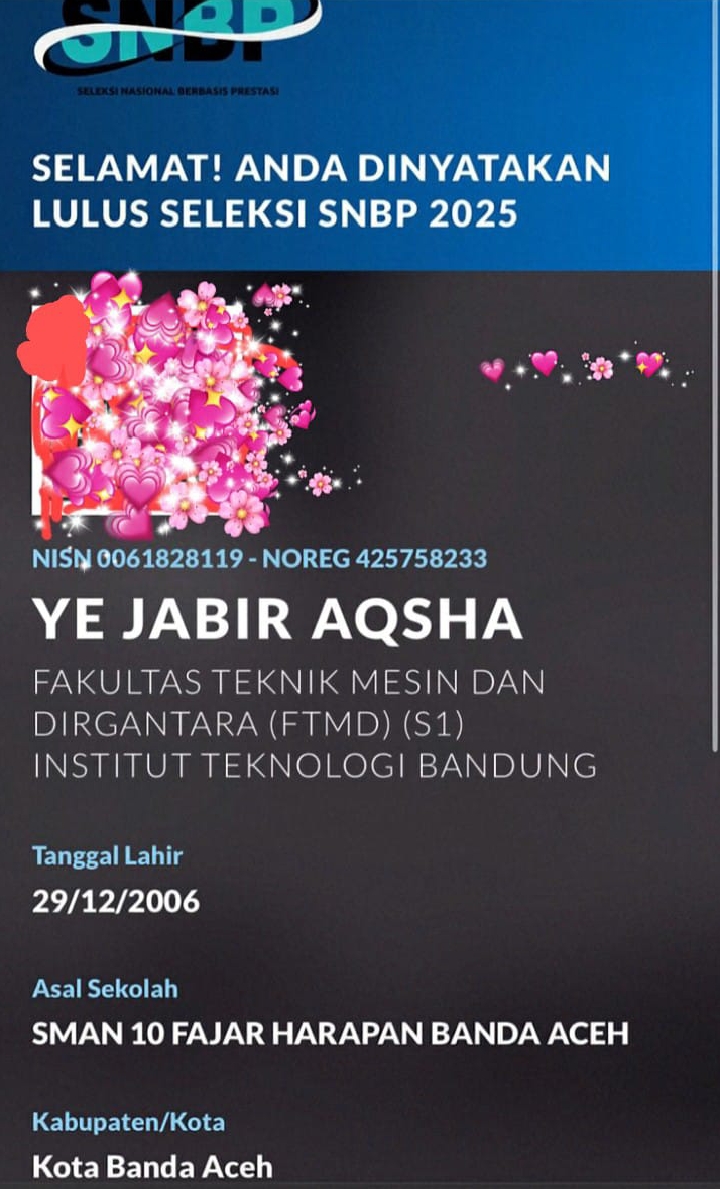 Kota Langsa – Anak seorang Ibu penjual kue keliling asal Kota Langsa Ye Jabir Aqsha ukir prestasi gemilang setelah dinyatakan lulus seleksi SNBP 2025 di Fakultas Teknik Mesin dan Dirgantara (FTMD) di Institut Teknologi Bandung (ITB).